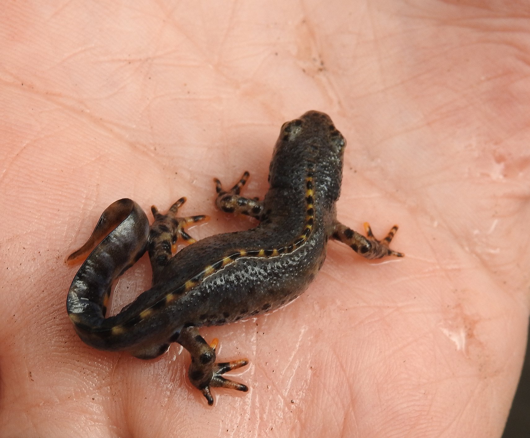 Zuerst fanden wir Molche. Wilfried zeigte uns, wie man Männchen und Weibchen unterscheiden kann und wie man Teichmolche von Bergmolchen unterscheiden kann. Ersteres durch einen scharfen Blick in die Intimsphäre: Männchen haben aufgequollene Hoden, schwangere Weibchen einen dicken Bauch. Das zweite durch die Zeichnung: Teichmolche haben mehr orange Flecken auf dem Bauch und Bergmolche eine ins bläuliche gehende Rückenfärbung. Dann fanden wir endlich auch einen Frosch. Der dicke Bach wies ihn als schwanger und daher weiblich aus, die Zeichnung als Grasfrosch. Die gefundenen Tierchen wurden über die Straße getragen und fürsorglich in mit Wasser gefüllten Gräben gesetzt.