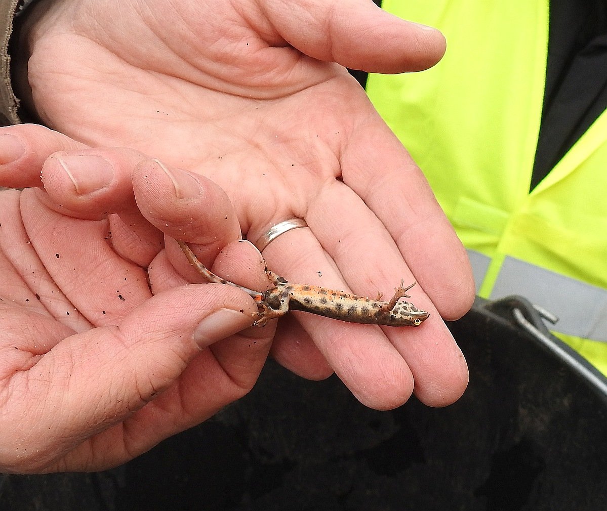 Auf der ganzen Strecke, die der NABU Mühlheim betreut, wurden an dem Tag lediglich 2 Frösche und 11 Molche gefunden. Das ist ein katastrophal niedriges Ergebnis, das natürlich im Zusammenhang mit den beiden letzten trockenen Sommern steht.