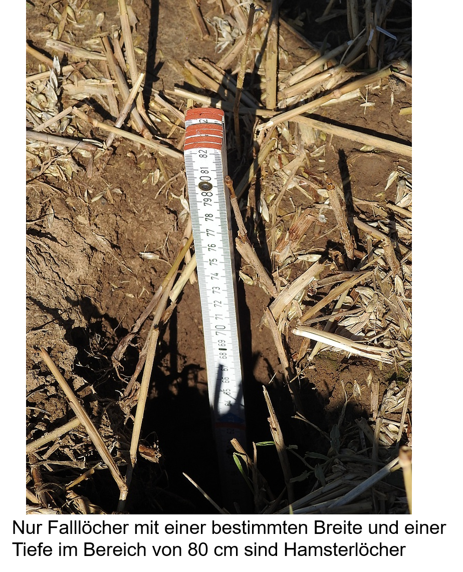 Dann geht es los: 6 Personen, 3 Frauen und 3 Männer haben sich eingefunden, die sich für diese stark bedrohte Tierart engagieren und für sie ihre Freizeit opfern, natürlich ehrenamtlich. In einem Abstand von 7 Schritten zwischen den einzelnen Beobachtern wird der ganze Acker abgegangen und die nächste Breite wieder zurück. Dabei wird nach den hamstertypischen Löchern geschaut. Löcher von Mäusen sind kleiner, die von Wühlmäusen können zwar größer sein, sind aber nicht tief genug und die Erdhaufen daneben haben eine krümelige Konsistenz. Wir haben auch Löcher gefunden, die von Füchsen auf der Suche nach Mäusen ausgehoben wurden und Kuhlen von Feldhasen.