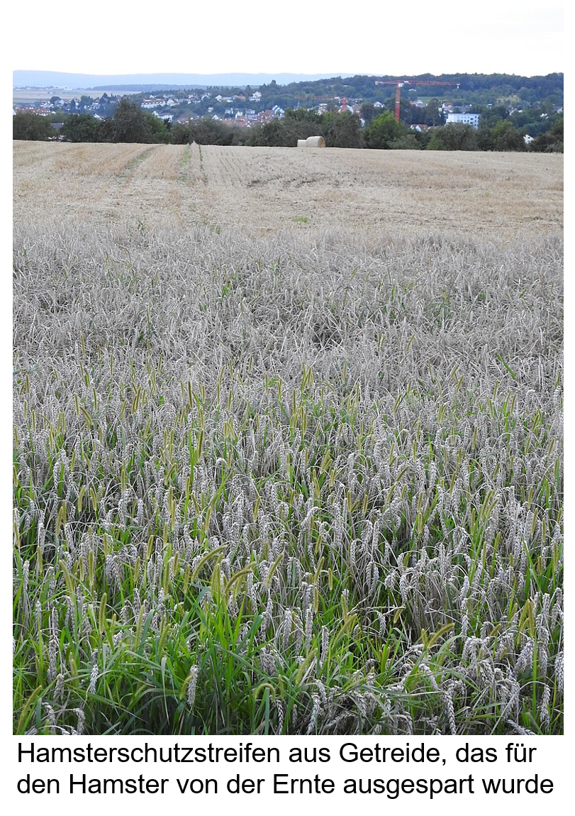 Es gibt inzwischen Maßnahmen zum Schutz der verbliebenen Feldhamster. Auf einigen Äckern sind Streifen von Getreide stehen geblieben, die sogenannten Hamsterschutzstreifen. Von diesen profitieren auch weiter hoch gefährdete Tiere der Feldflur wie Rebhühner und Feldhasen.