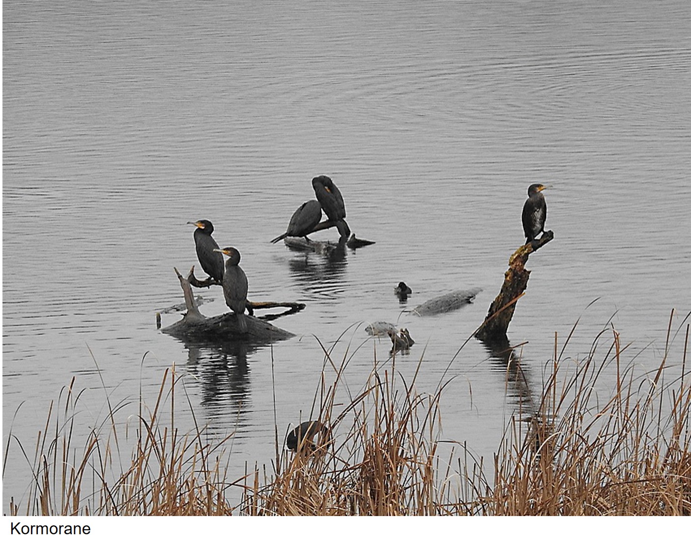 Die beobachteten Vogelarten: Rohrdommel, Krick-, Schnatter-, Reiher-, Tafel- , Stock- und Löffelente, Silber- und Graureiher, Höckerschwan, Kanada- und Nilgans, Haubentaucher, Blässhuhn und Kormoran.