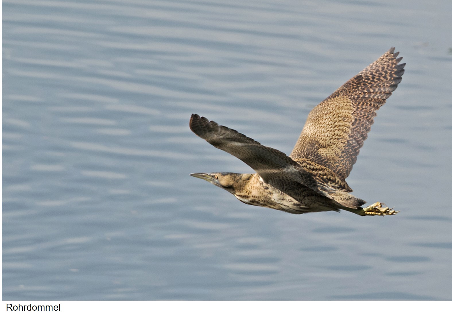 waren die lauten Rufe von Krickenten zu hören. Gleich beim ersten Stopp ein Highlight: Überraschend flog eine Rohrdommel vor den erstaunten Augen der Gruppe über den See, um ins weit entfernte