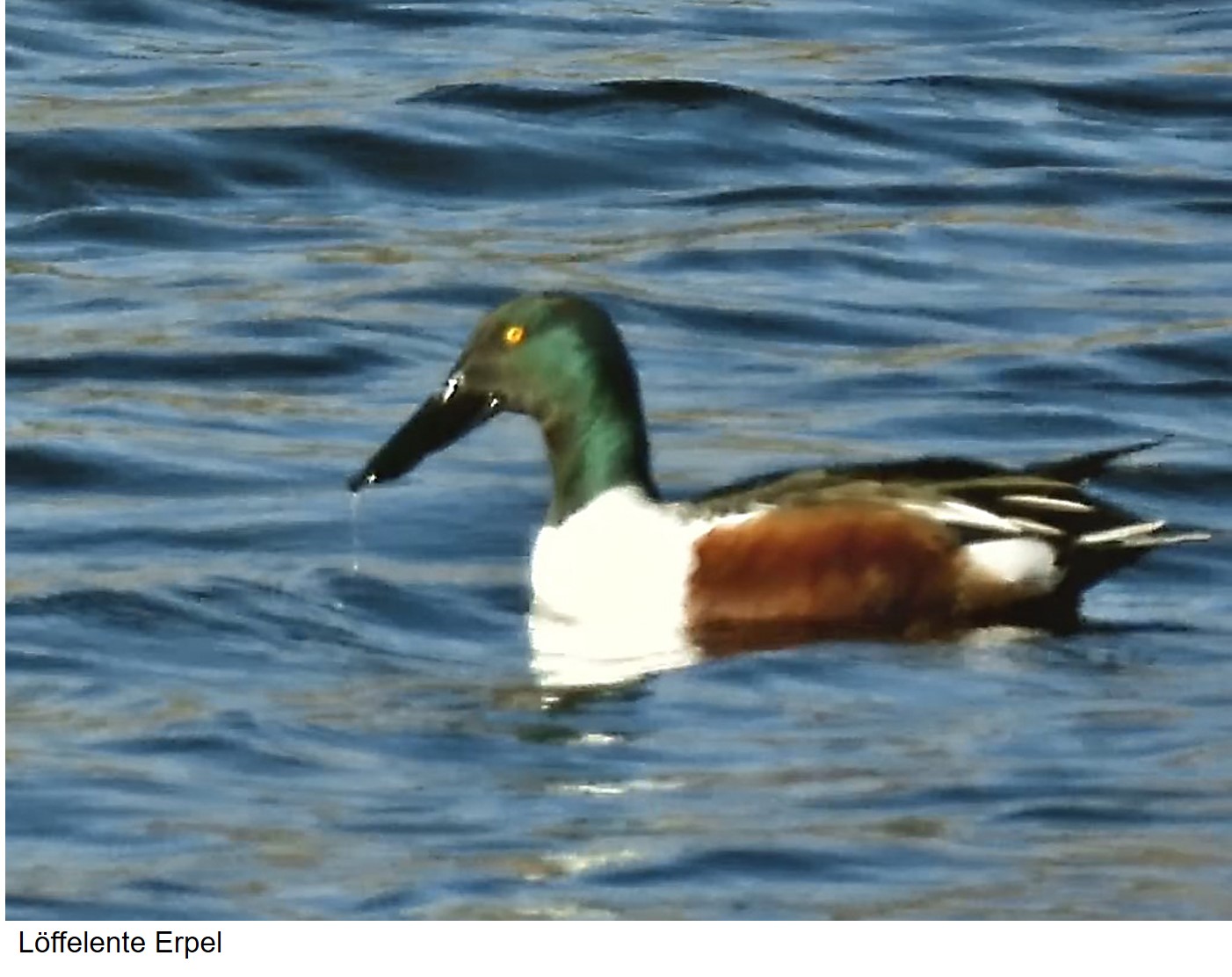 Auf der anderen Seeseite dann eine besondere Beobachtung: Ein Löffelente-Erpel kreiste unaufhörlich, um mit diesen Bewegungen Nahrungspartikel an die Oberfläche zu strudeln. Diese Entenart hat