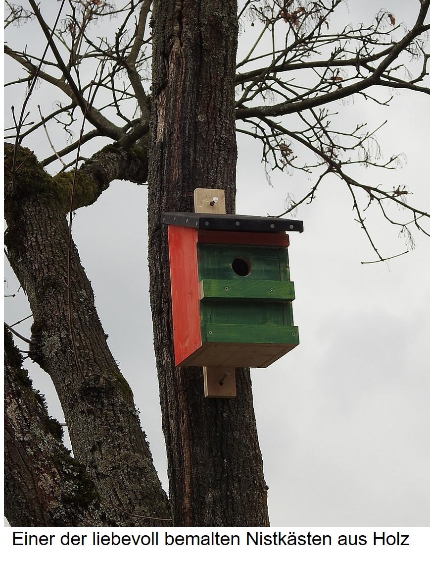 liebevoll von den Kindern angemalten Nistkästen an passenden Bäumen angebracht.