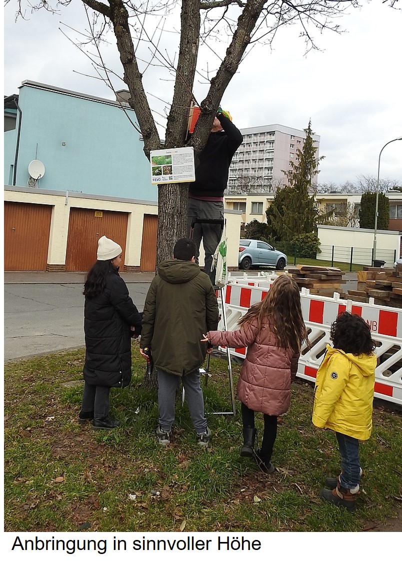 Die Höhe sollte so gewählt werden, dass nicht jeder, der da vorbeikommt, mal reinschauen kann. Aber nicht zu hoch, damit die Kästen zur Kontrolle und Reinigung mit einer normalen Leiter noch erreicht werden können, also in 2,5 bis 3 m Höhe.