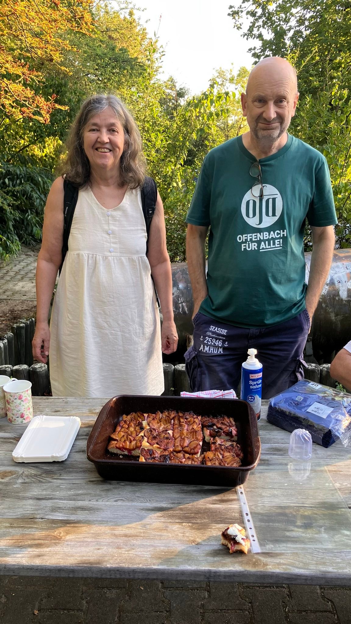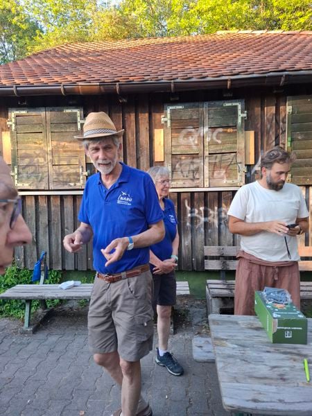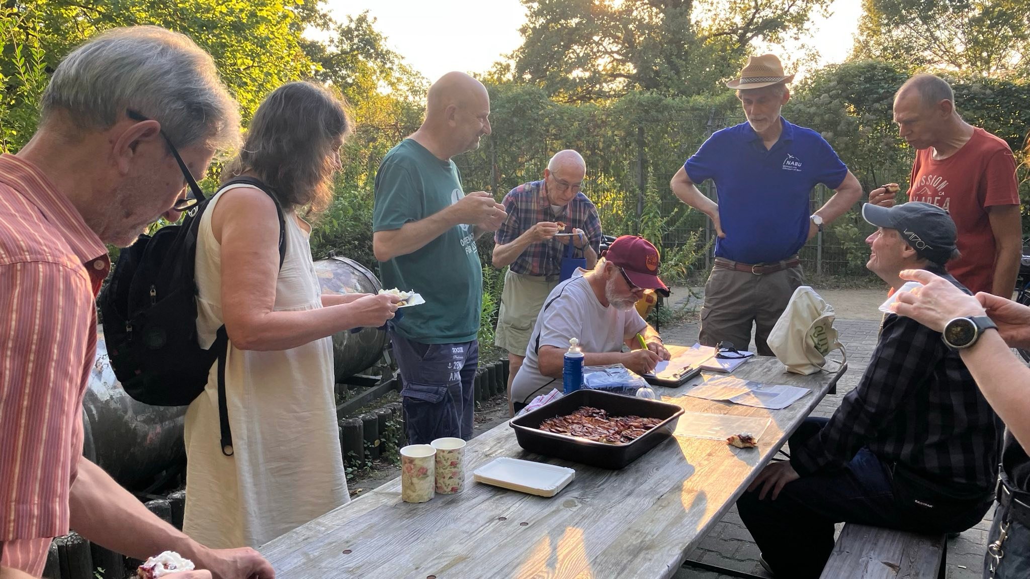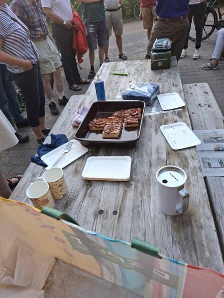 Bei Sonnenschein und warmen Wetter fand sich eine Schar Mitglieder inklusive des Vorstands an der Hütte ein. Gleich nach der Begrüßung der Gäste stellten zwei Mitglieder ein großes Blech selbstgebackenen Zwetschgenkuchen auf den Tisch. Mit dem Hinweis "morgen schmeckt er nicht mehr so gut" wurden wir erfolgreich aufgefordert, den Kuchen seiner Bestimmung zuzuführen (wahlweise auch mit Sahne). Gegen die Hitze halfen ein paar Kaltgetränke. Auch die Torf-Toilette war am Start.