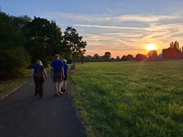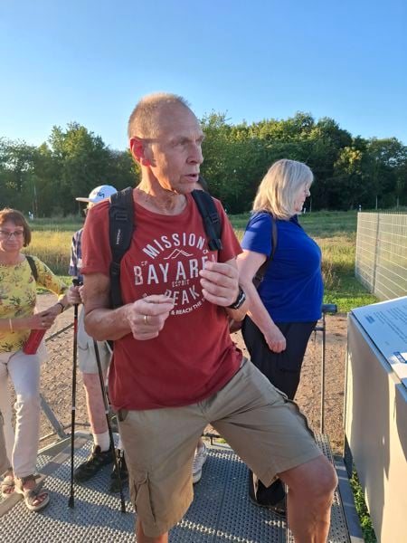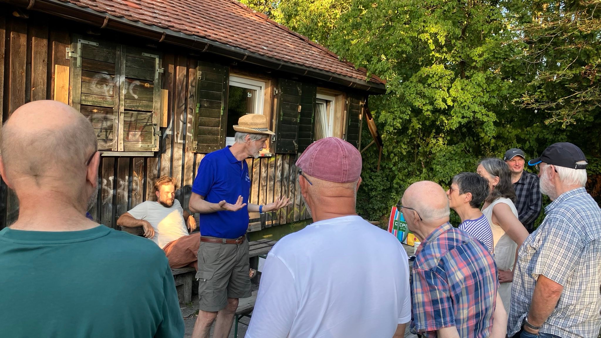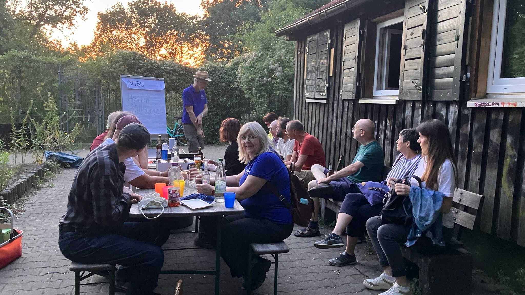 In gemütlichen Tempo ging es wieder zurück zur Buchhügel-Hütte. Alle, die beim Richtfest nicht dabei waren, konnten sich darin noch ein Bild vom neuen Zustand des Gebäudes machen. Bei den letzten Stücken Kuchen plauderten wir bis zum Einbruch der Dunkelheit und sammelten Ideen. Welche Veranstaltungen könnte der NABU hier anbieten? Wie wollen wir Präsenz zeigen, um Vandalismus vorzubeugen? Als die Sonne gegangen war, gingen schließlich auch die Gäste.