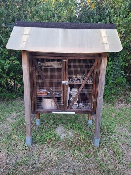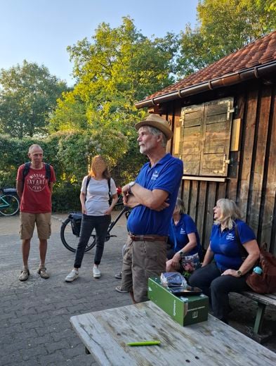 In der Nähe der Wiese konnten wir auch das NABU-Insektenhotel begutachten. Mit einer kleinen Hinweistafel am Fußweg und einer großen NABU-Erklärtafel auf der Rückseite des Häuschens. Warum die Stadt das große Schild nicht vorne aufstellen wollte, bleibt ihr Geheimnis. Waltraud und Gerd erzählten uns von der Historie des Insektenhotels, wie auch vom Verhalten der Hautflügler, die es bewohnen. Eine wichtige Erkenntnis war für mich, dass nur 35% der Wildbienen in Röhren nisten. Alle anderen sind auf lockeren, freien Boden angewiesen.