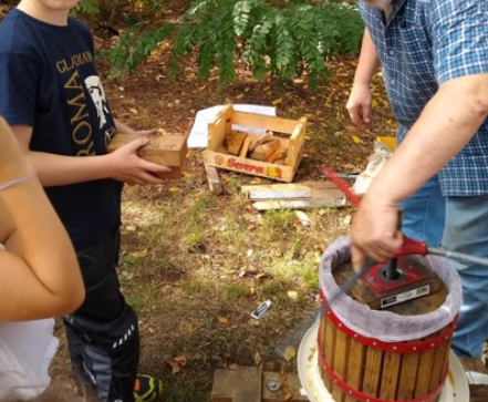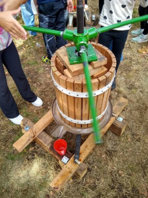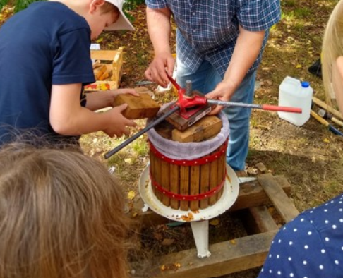 Jedes Kind führte alle Arbeitsgänge einmal durch. Besonders beliebt war die Presse. Immer zu dritt wurde sie gedreht, sodass nach und nach der leckere Apfelsaft herauslief.