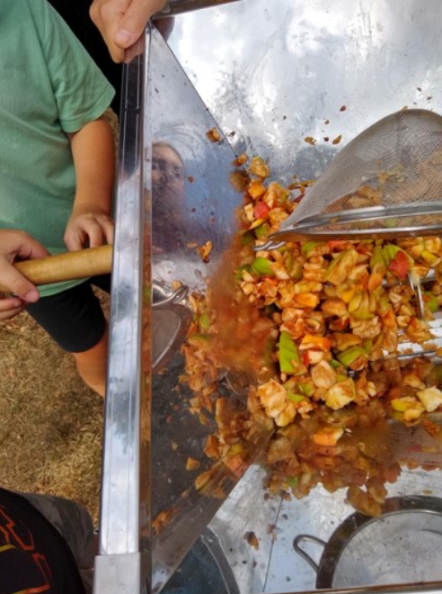 die Äpfel, die zuvor von den beiden Klassen als Patenprojekt in der Schule aufgelesen und geerntet worden waren. Unter Anleitung von Ernst von Hermanni baute das NABU-Team alles dafür Nötige auf.