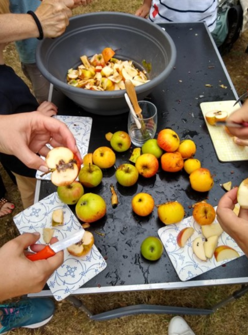 Eltern und Kinder genossen zusammen mit den NABU-Mitgliedern nach getaner Arbeit den ausgesprochen leckeren Apfelsaft.