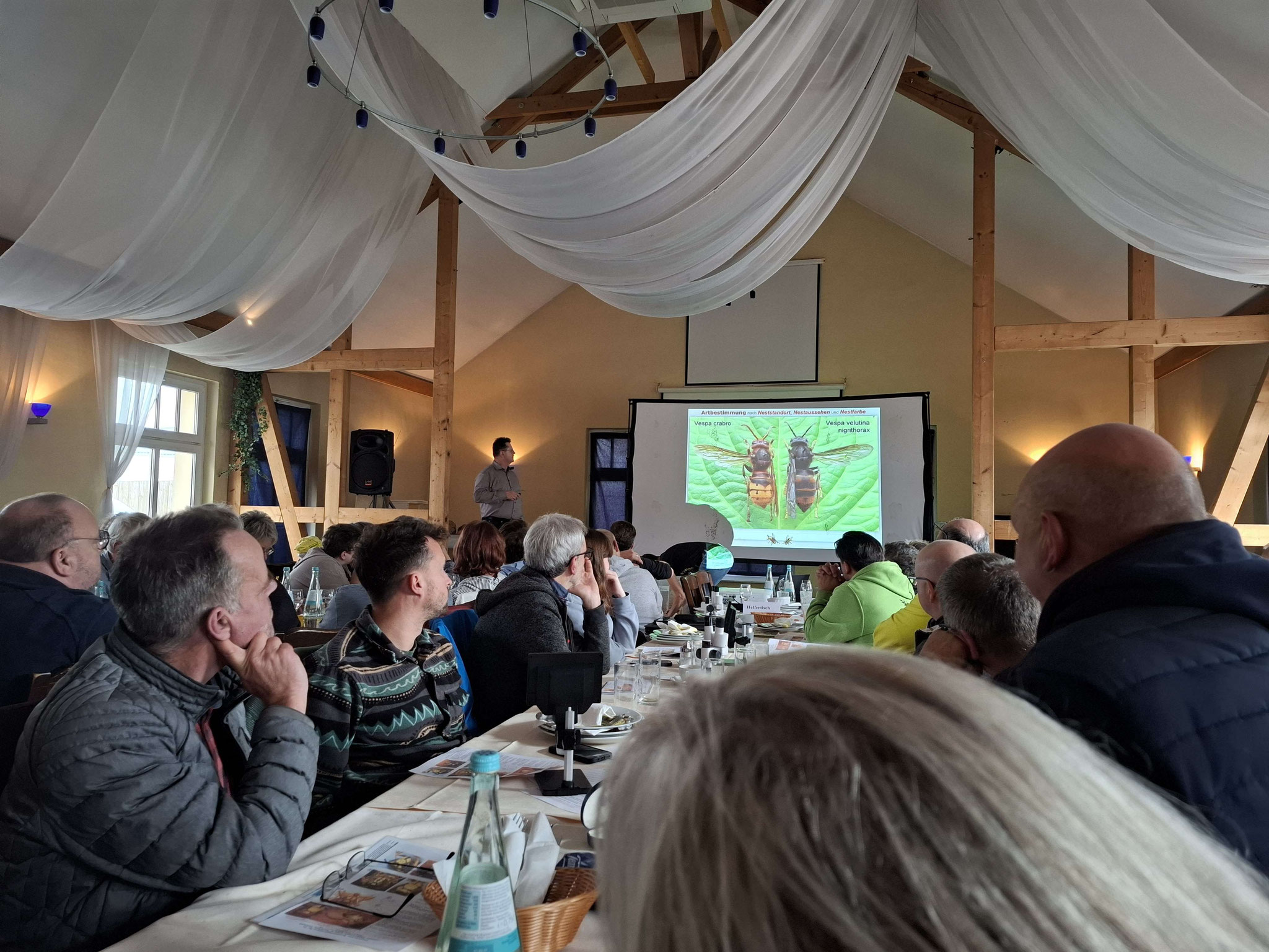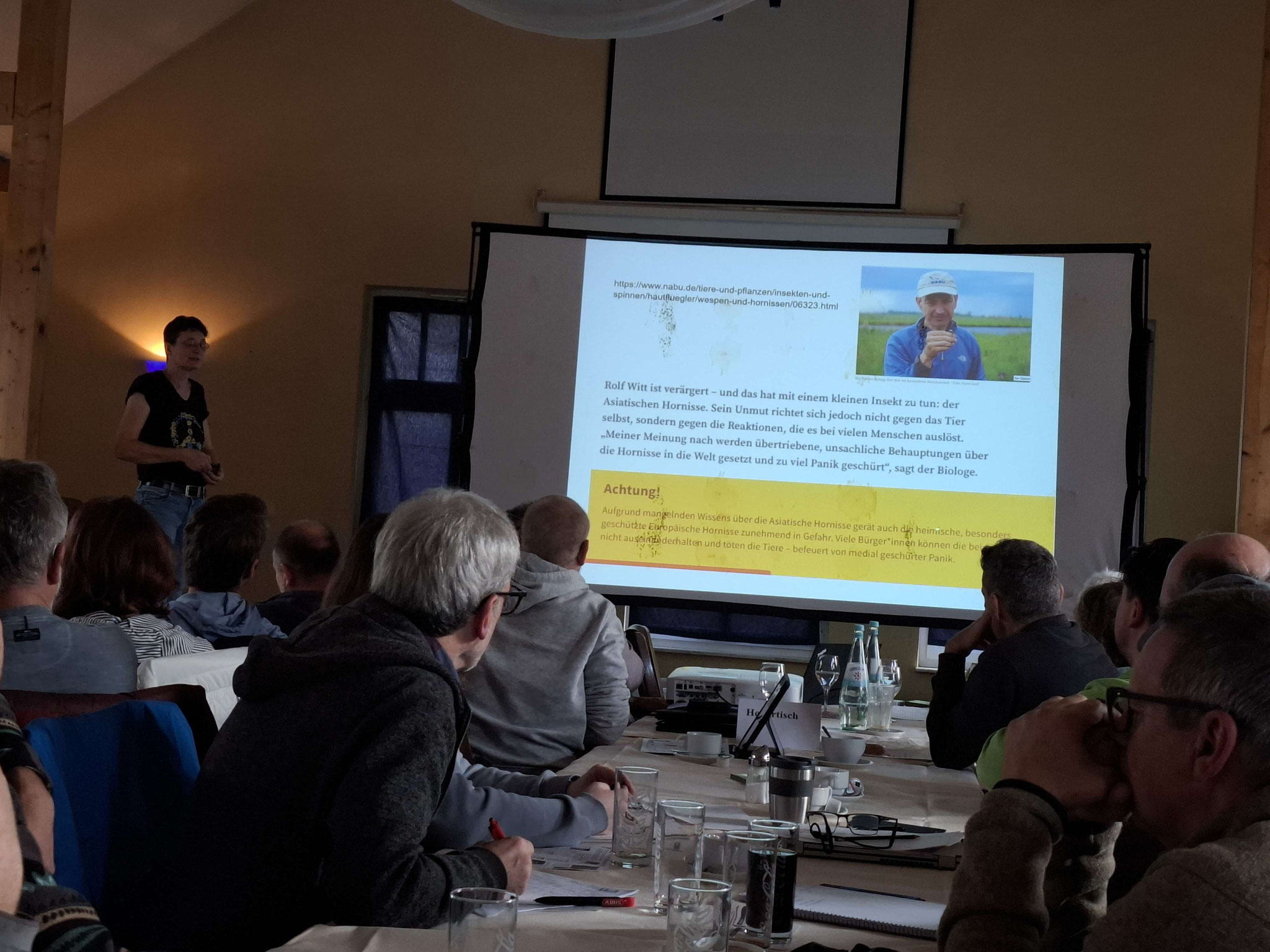Geboten wurde ein Seminar, das über Hornissen und Wespen informiert. Der Saal war voll, viele Interessierte wollten die Möglichkeit nutzen, von Fachleuten fundiertes Wissen zu erwerben. Unter den Teilnehmenden waren viele ImkerInnen, sowie Leute von der Feuerwehr und eben auch vom NABU.
