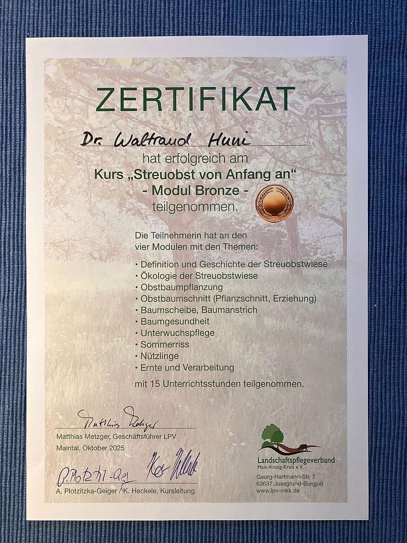 „Streuobst von Anfang an – Modul Bronze“, so nannte sich der Kurs des Landschaftspflegeverbands Main-Kinzig-Kreis, auf den Adela und ich Ende des letzten Jahrs aufmerksam wurden. Er sollte das häufig verloren gegangene Wissen um die Bewirtschaftung von Streuobstwiesen vermitteln.