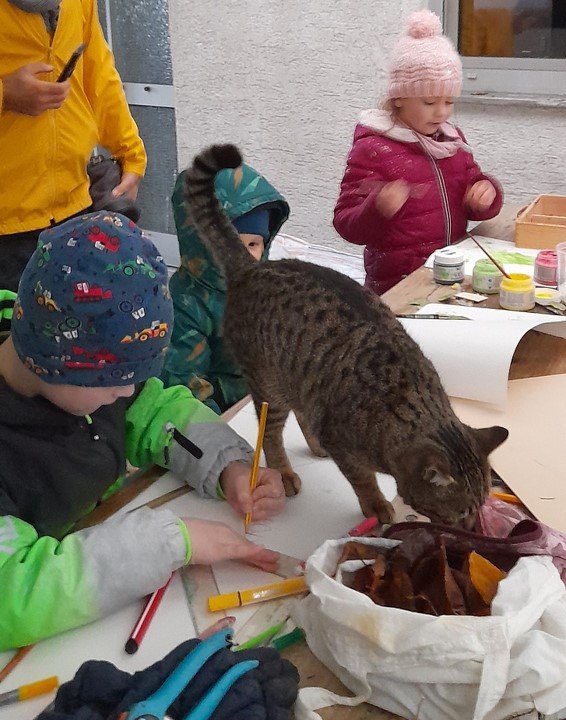 Es gab viel zu Toben, zu Streicheln und zu Sammeln so dass wir keine Zeit für Aufräumarbeiten oder Putzen hatten. Es wurden Blätter gesammelt, Blumen, Tannenzapfen, Wildrosenzweige und große und kleine Äste. Aus diesem Vorrat wird nächstes Mal ein Webrahmen hergestellt.