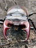 sehr groß. Mit diesen Zangen kämpft er gegen andere Hirschkäfer-Männer, indem er sie vom Ast herunter schubst. Kneifen oder kauen kann er damit jedoch nicht. Darum schleckt er mit der Zunge