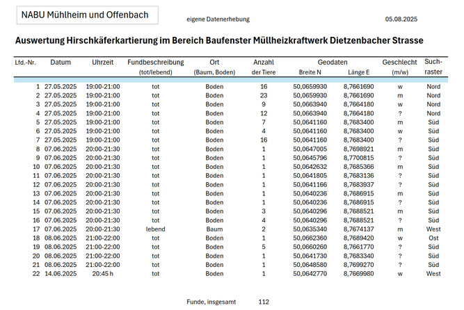 In Summe wurden Totfunde von 110 Hirschkäfern aus Vogelfraß festgestellt. 2 männliche Prachtexemplare wurden lebend vorgefunden. Die Details können aus der unten stehenden Tabelle ersehen werden.