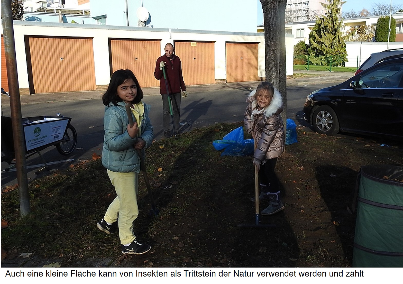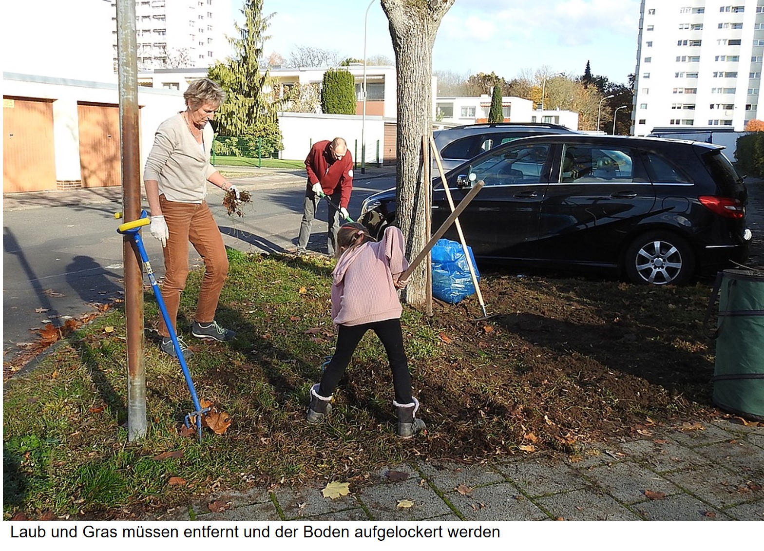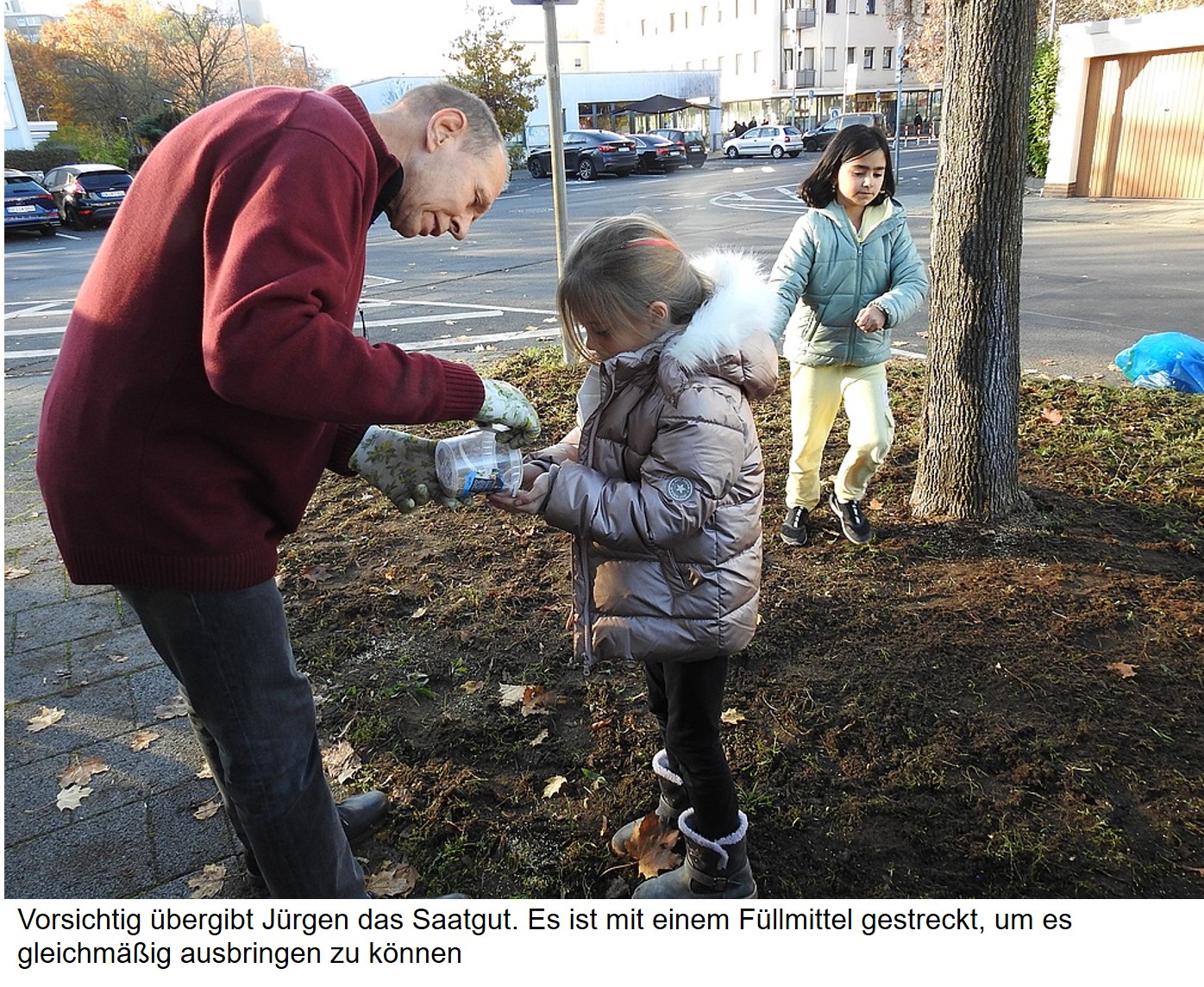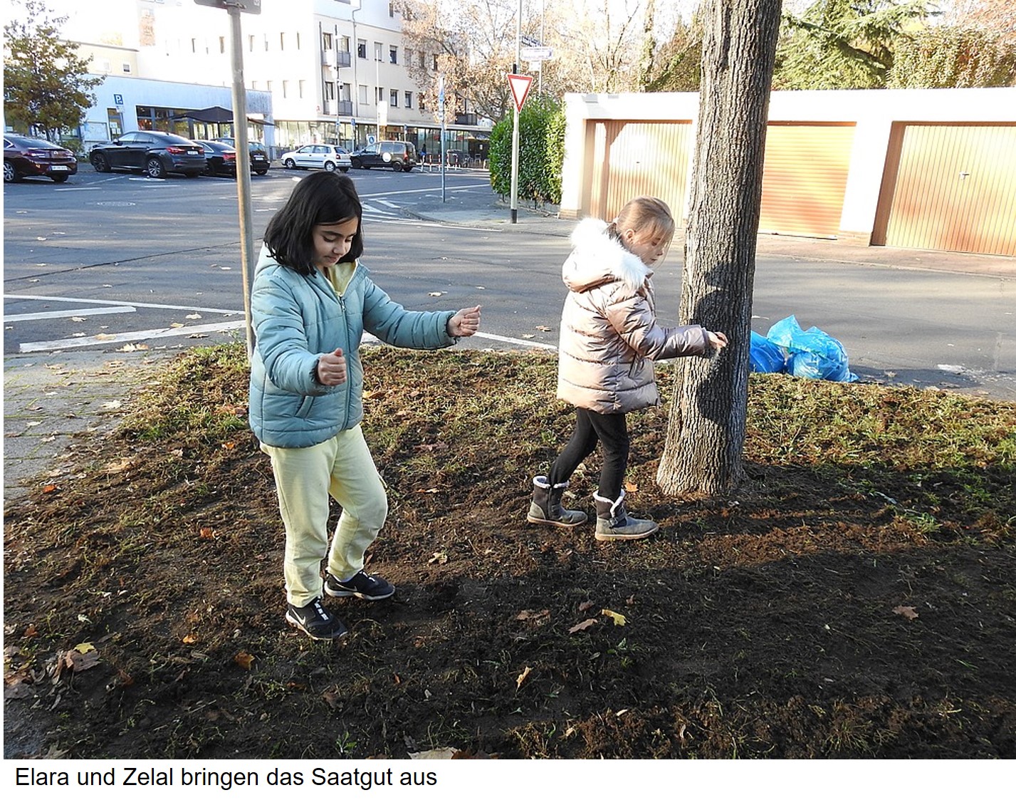 Zuerst musste Laub und Gras entfernt und der Boden für das Saatgut aufgelockert werden. Dabei haben uns Elara und Zelal tatkräftig unterstützt. Die beiden Mädchen wohnen in der Nachbarschaft und