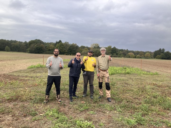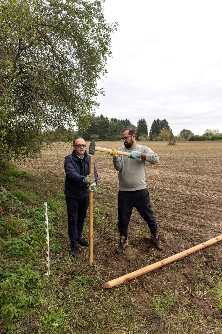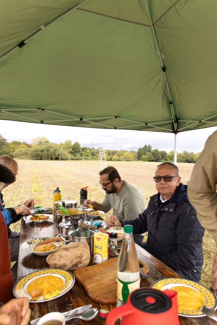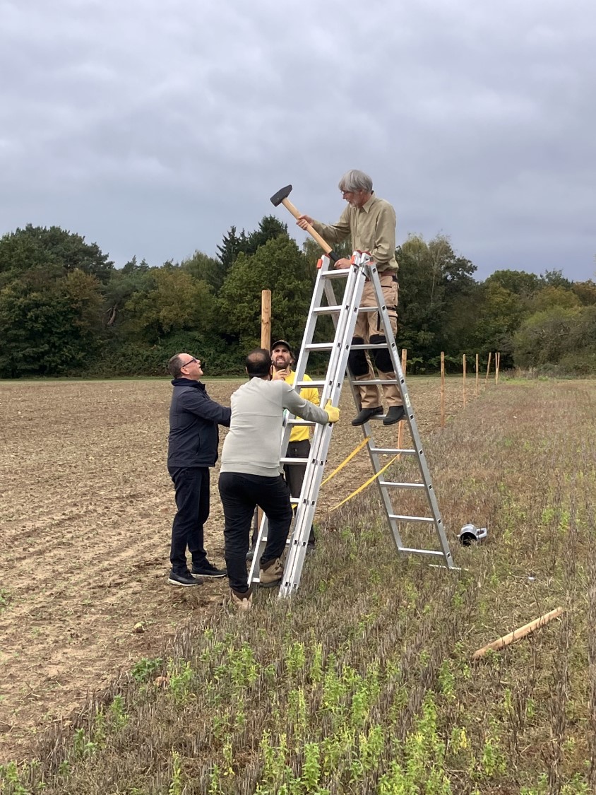 Wir hatten das große Glück, dass die Mitarbeiter der Firma DeSter mit Thomas, unserem NAJU-Vertreter, sich entschlossen hatten, ihren Social Day bei uns zu leisten, die diese Arbeit mit viel Einsatz angingen. Und so haben sie 22 Pfähle eingeschlagen, eine sehr schweißtreibende Arbeit, die danach auch noch einiges an Muskelkater verursacht hat. Zudem wurden auch Ansitze für Greife aufgebaut. Unterstützt wurden sie von Gerd und Jürgen. Waltraud kochte für sie eine leckere Kürbissuppe. Dazu gab es Würstchen, wahlweise normal und vegan, und danach noch einen selbstgebackenen Kuchen mit Äpfeln von der Streuobstwiese. Danke an Thomas, Thomas und Asad.