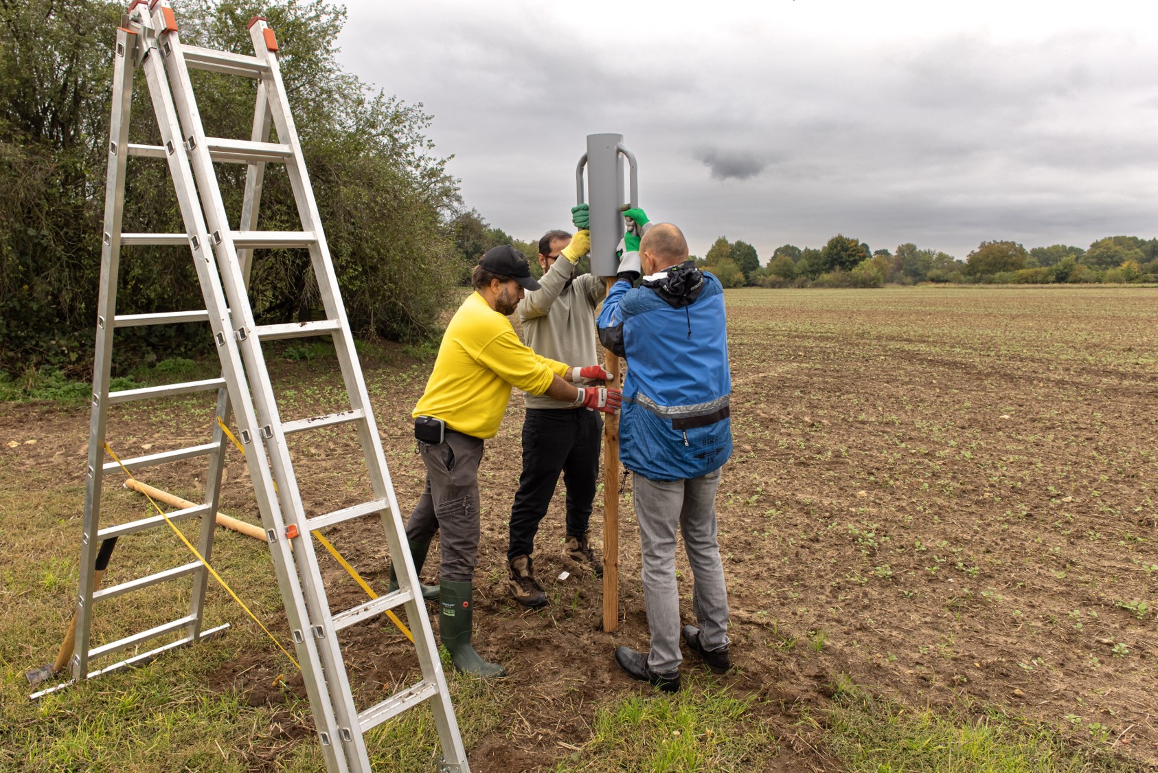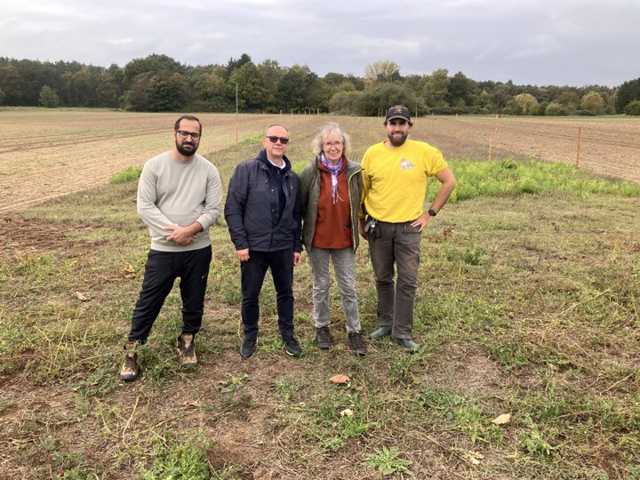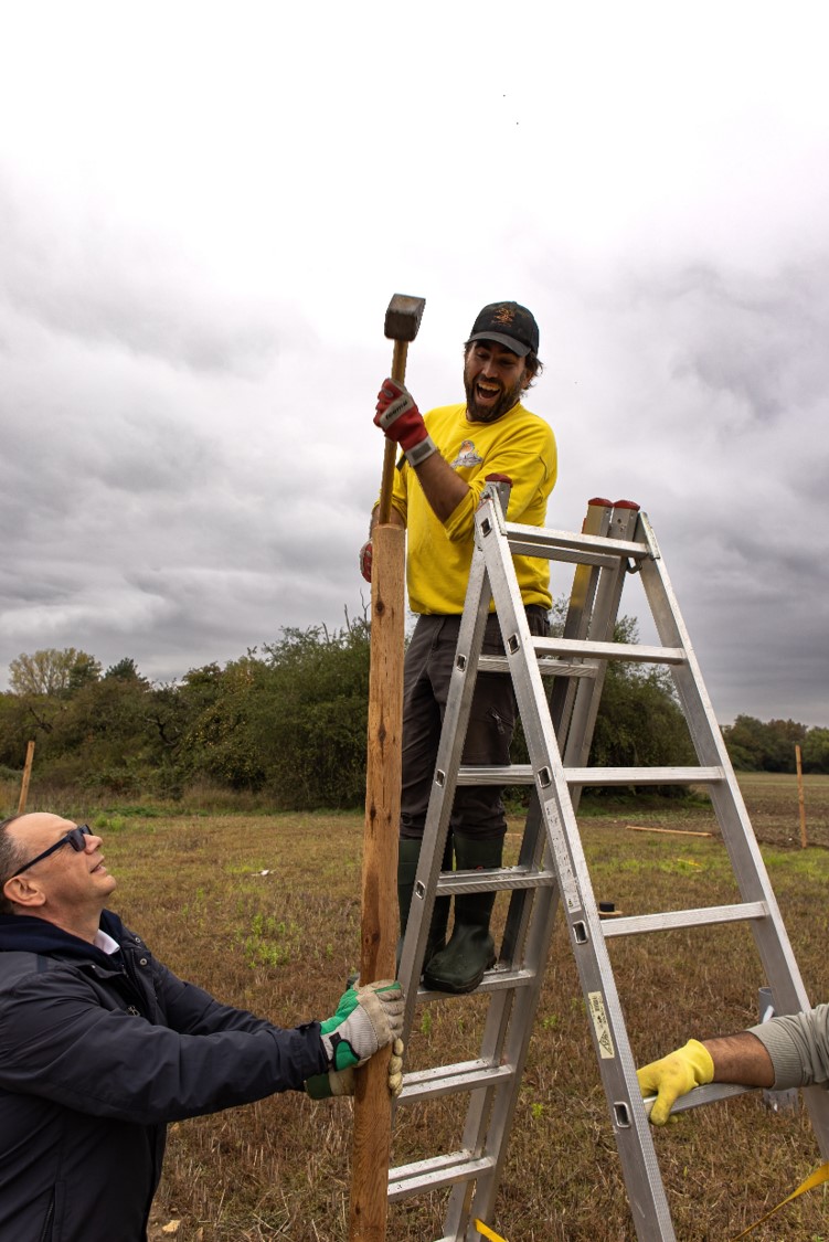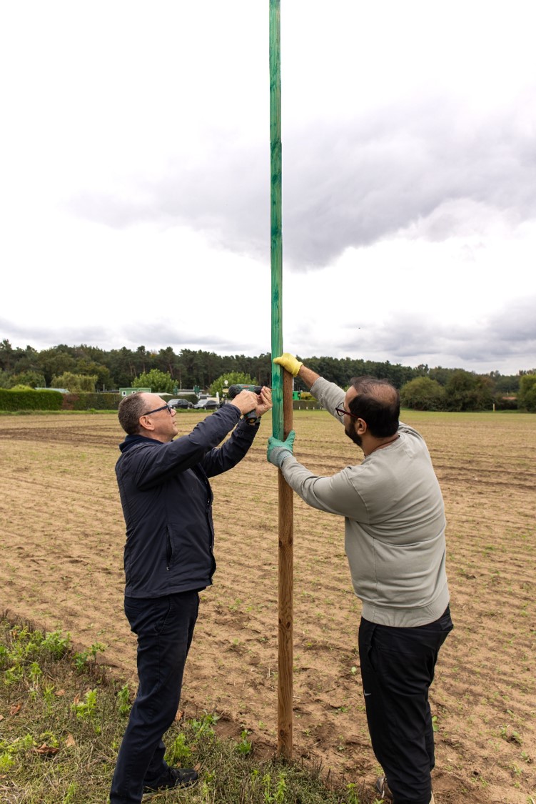 Wir hatten das große Glück, dass die Mitarbeiter der Firma DeSter mit Thomas, unserem NAJU-Vertreter, sich entschlossen hatten, ihren Social Day bei uns zu leisten, die diese Arbeit mit viel Einsatz angingen. Und so haben sie 22 Pfähle eingeschlagen, eine sehr schweißtreibende Arbeit, die danach auch noch einiges an Muskelkater verursacht hat. Zudem wurden auch Ansitze für Greife aufgebaut. Unterstützt wurden sie von Gerd und Jürgen. Waltraud kochte für sie eine leckere Kürbissuppe. Dazu gab es Würstchen, wahlweise normal und vegan, und danach noch einen selbstgebackenen Kuchen mit Äpfeln von der Streuobstwiese. Danke an Thomas, Thomas und Asad.