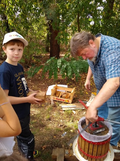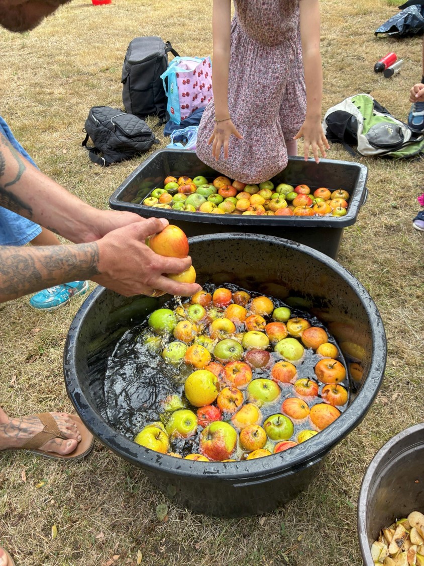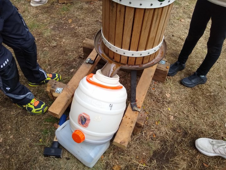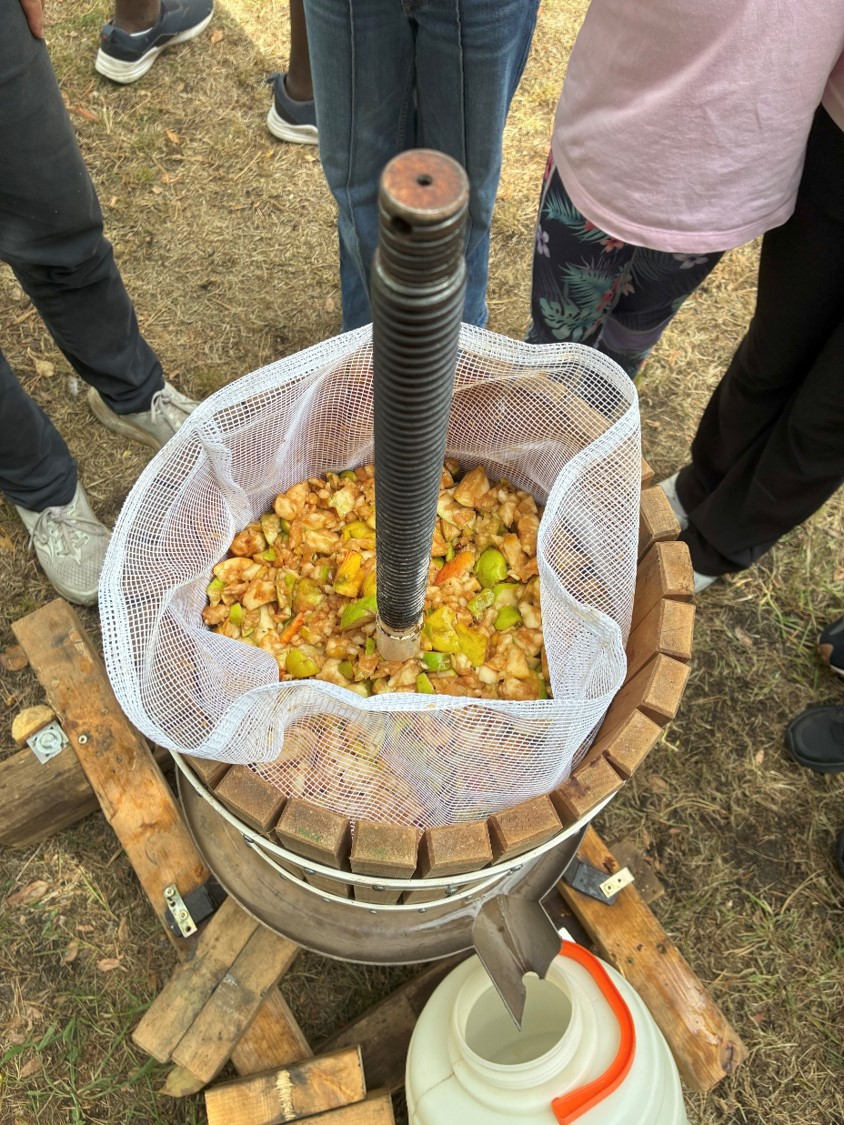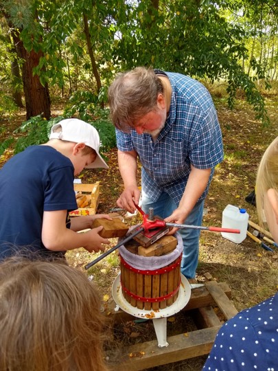 Am Freitag, dem 29.08.2025 kelterten Kinder und Eltern der Klassen 3c und 1b der Geschwister-Scholl-Schule in Dietesheim gemeinsam mit den Kindern der NAJU-Gruppe die Äpfel, die zuvor von den beiden Klassen als Patenprojekt in der Schule aufgelesen und geerntet worden waren. Unter Anleitung von Ernst von Hermanni baute das NABU-Team alles dafür Nötige auf. Jedes Kind führte alle Arbeitsgänge einmal durch. Besonders beliebt war die Presse. Immer zu dritt wurde sie gedreht, sodass nach und nach der leckere Apfelsaft herauslief.