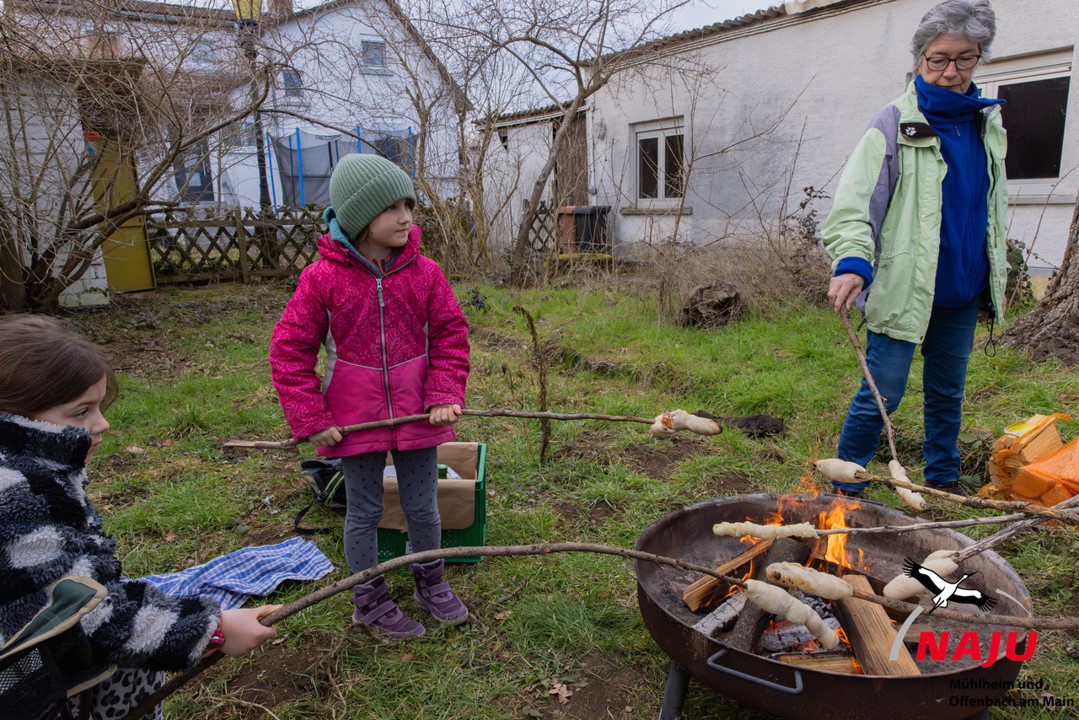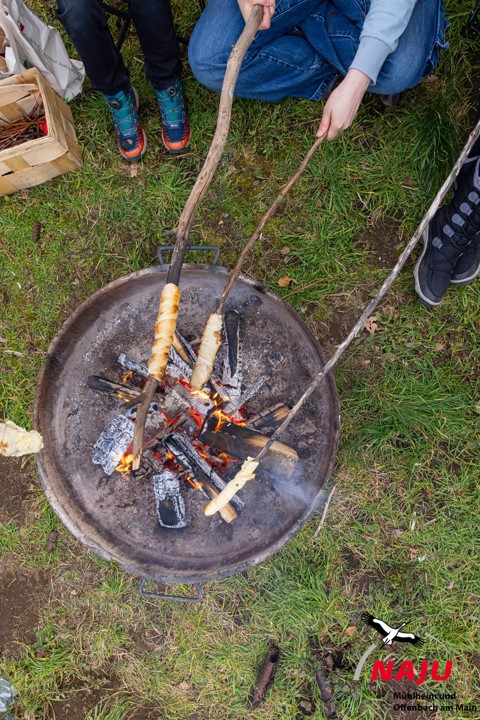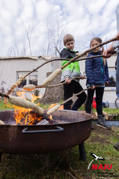 Der Teig war schon vorbereitet und so mussten wir ihn nur noch um den Stock wickeln und schon konnten wir den Stock über das Feuer halten. Wir haben in das Stockbrot noch etwas Schokolade geschmuggelt und außer, dass sie ausgelaufen ist, hat es wunderbar geschmeckt. Nicht alle Kinder haben das Brot lange genug über das Feuer gehalten, aber dafür waren ja auch ein paar Erwachsene dabei.