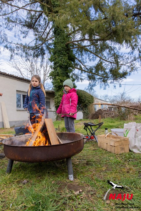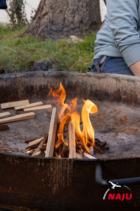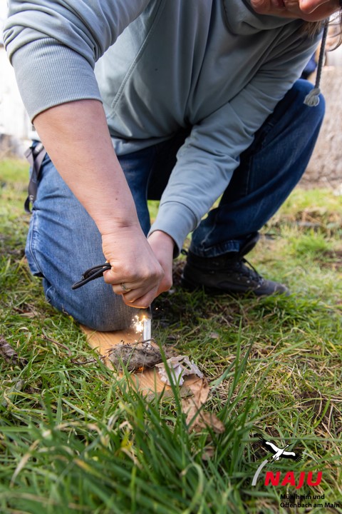 Wir haben heute endlich richtig in das Jahr 2025 gestartet. Zur Feier des Tages haben wir eine Feuerschale mitgebracht und haben versucht mit Feuerstahl ein Feuer zu machen. Nicht nur die Kinder, sondern auch wir Erwachsenen haben uns daran versucht. Zum Glück hatten wir eine Expertin dabei, die das Feuer ohne Probleme anbekommen hat.