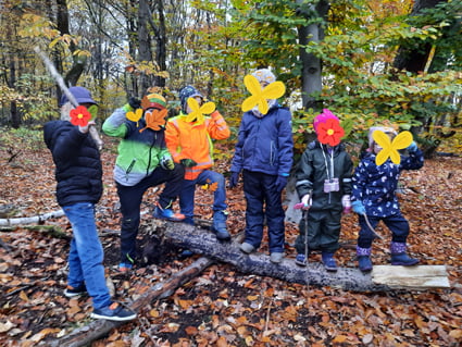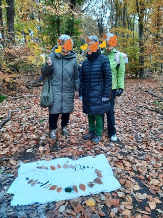 Im bunten Herbstwald haben wir zuerst mit Hilfe von Strohhalmen Laubsauger gespielt. Wir haben ausprobiert, ob man Blätter mit der Saugkraft der eigenen Lungen aufsammeln und an andere weitergeben kann. Zwei Kinder haben sogar einen Wettlauf gemacht, wer von ihnen am schnellsten eine bestimmte Menge Blätter in sein Körbchen transportieren kann.