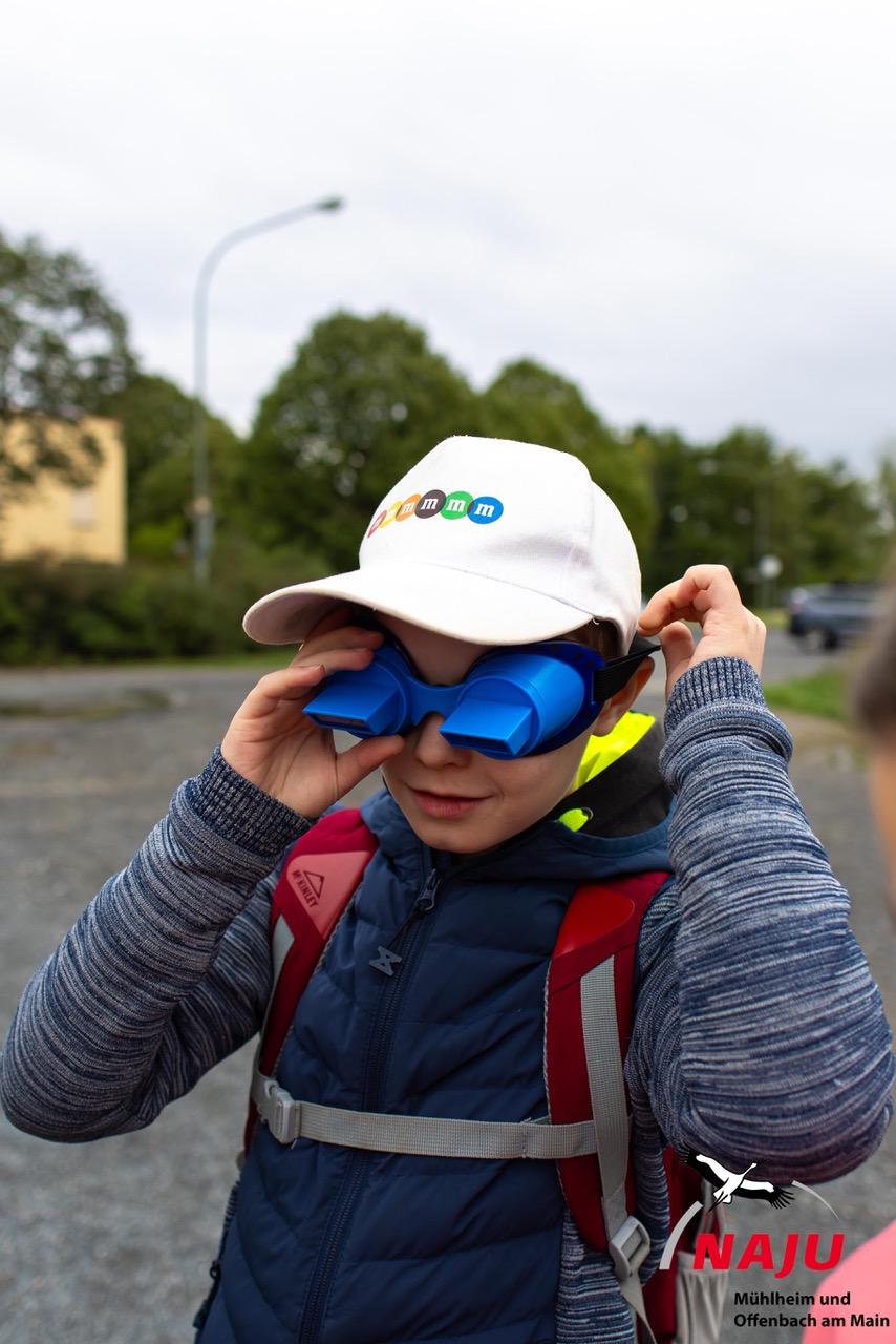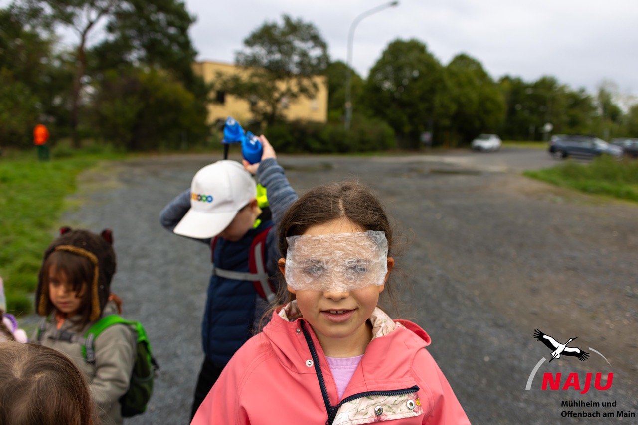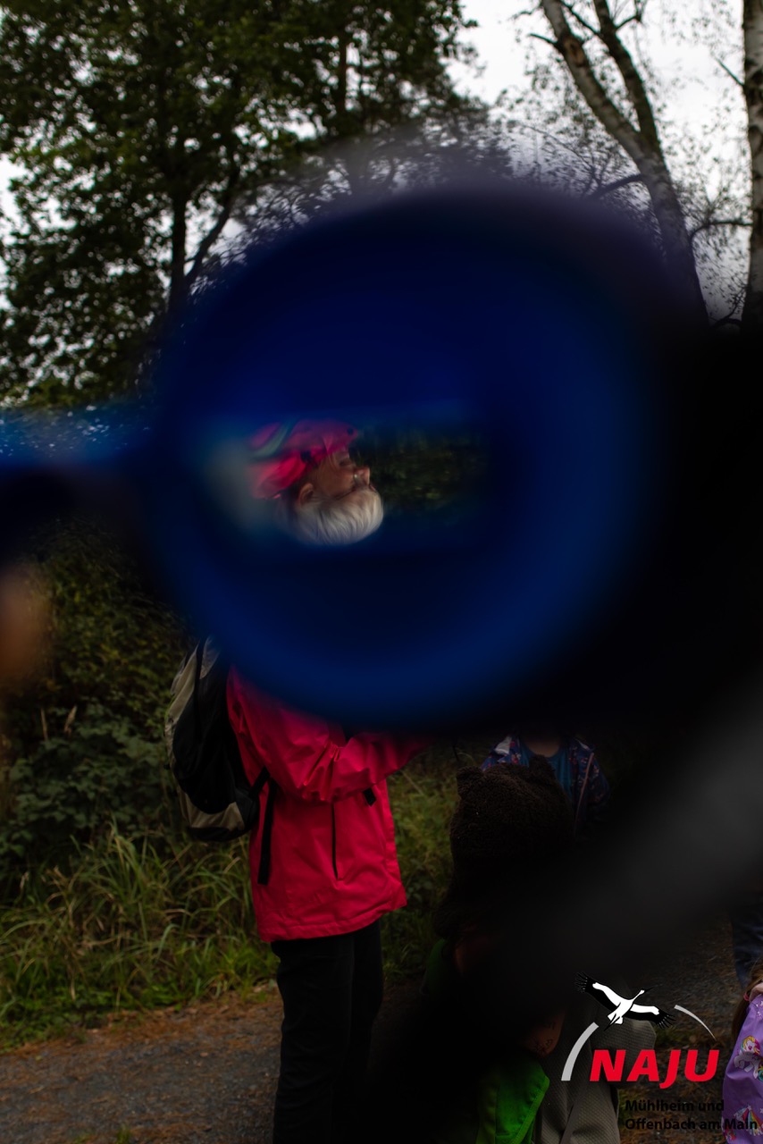Die kleine Strecke bis zum Wald bewältigten wir mit unterschiedlichen Brillen. Eine Brille, die uns wie Insekten mit Facettenaugen sehen lässt, eine Wildschweinbrille, eine Fledermausbrille und eine, die die Welt verdreht und alles auf den Kopf stellt. Die Fledermausbrille hatte es in sich! Es war nämlich butzedunkel. Die Fledermaus sieht fast nichts. Sie orientiert sich, indem sie Töne von sich gibt, die so hoch sind, dass wir Menschen sie nicht hören können. Die Töne prallen an Hindernissen ab und kehren zu ihr zurück. Blitzschnell fangen die Ohren diesen Laut wieder auf und die Fledermaus weiß, wo das Hindernis ist und umfliegt es.