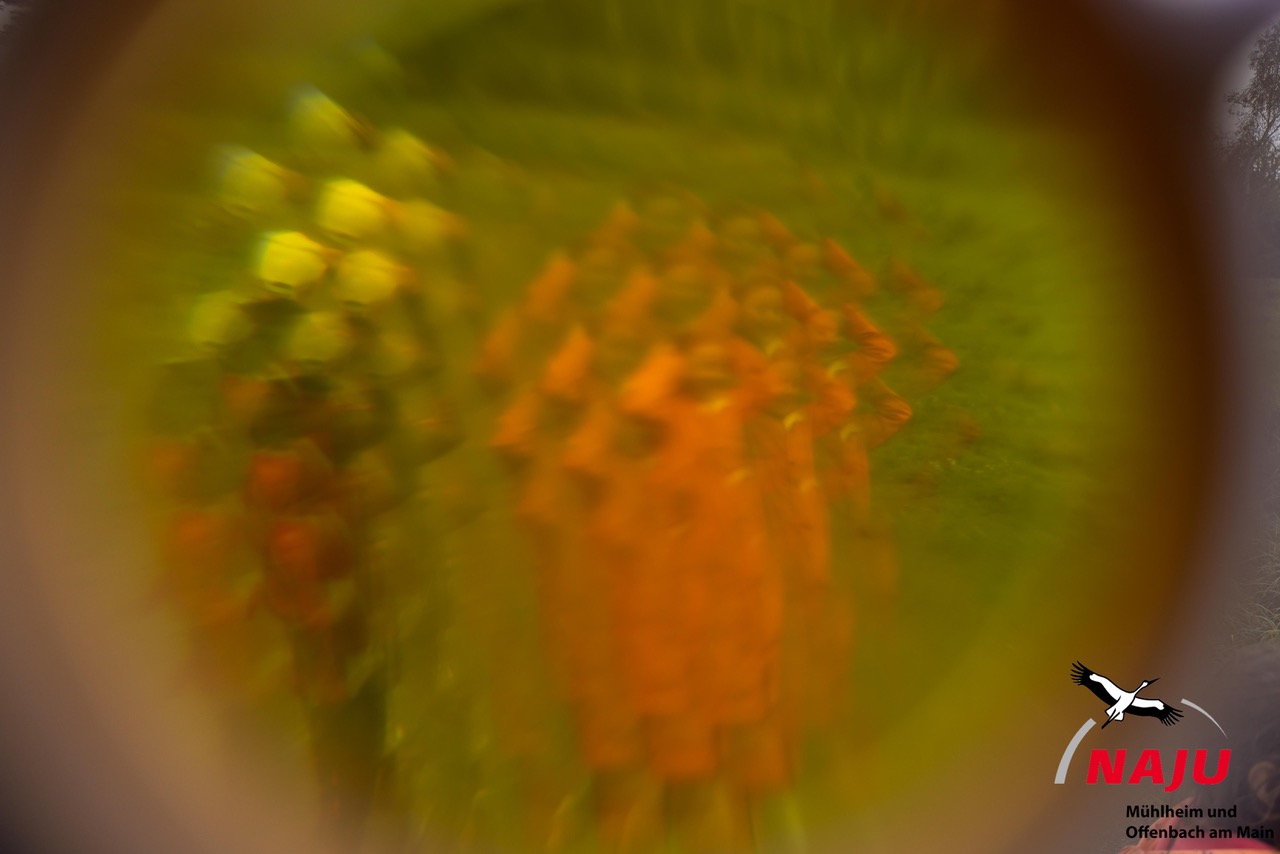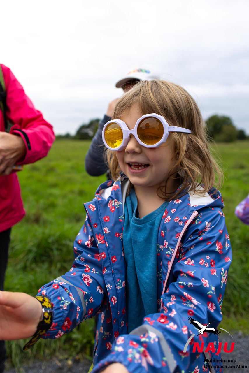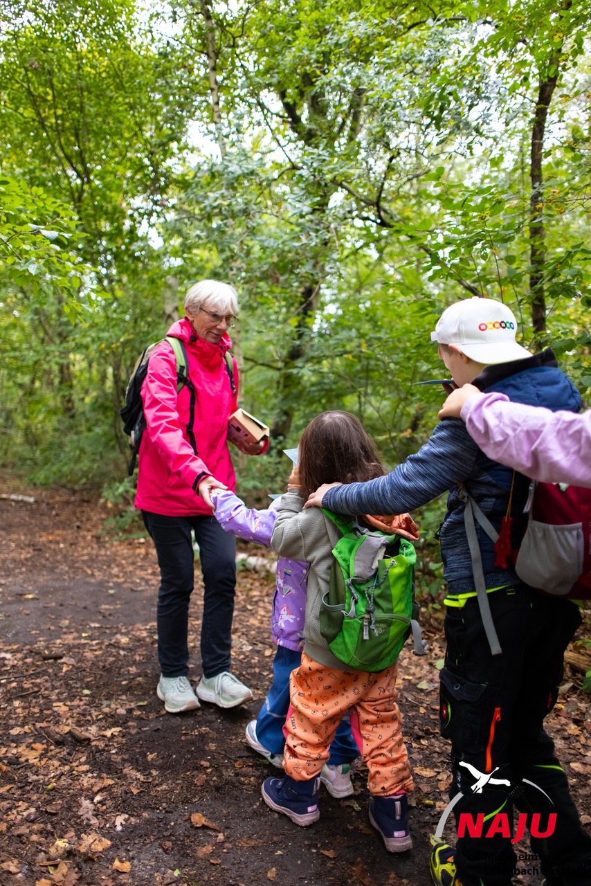 Die kleine Strecke bis zum Wald bewältigten wir mit unterschiedlichen Brillen. Eine Brille, die uns wie Insekten mit Facettenaugen sehen lässt, eine Wildschweinbrille, eine Fledermausbrille und eine, die die Welt verdreht und alles auf den Kopf stellt. Die Fledermausbrille hatte es in sich! Es war nämlich butzedunkel. Die Fledermaus sieht fast nichts. Sie orientiert sich, indem sie Töne von sich gibt, die so hoch sind, dass wir Menschen sie nicht hören können. Die Töne prallen an Hindernissen ab und kehren zu ihr zurück. Blitzschnell fangen die Ohren diesen Laut wieder auf und die Fledermaus weiß, wo das Hindernis ist und umfliegt es.