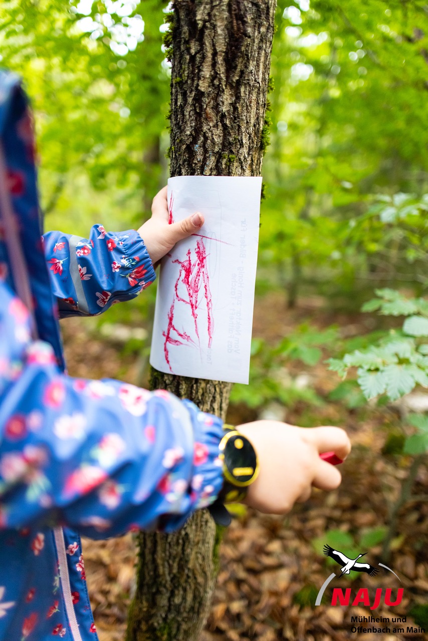 Mit der Fledermausbrille machten wir ein Spiel. Ein Kind war die Fledermaus mit Brille und sah nichts. Ein anderes Kind war ihr "Essen" - eine Motte - und musste ihr entwischen. Wir anderen standen um die beiden herum, fest eingewurzelt in der Erde, als wären wir Bäume. Aus diesem Kreis durfte keiner herauslaufen. Die Fledermaus rief: "Fledermaus" die Motte antwortete: "Motte", sodass die "Fledermaus" die "Motte" kriegen konnte. Es war ein tolles Spiel und jeder wollte unbedingt beides sein. So spielten wir es ziemlich oft. Später ahmten wir mit Kiefernzapfen den Fuchssprung nach und versuchten 3 Zapfen nacheinander in eine Schachtel zu werfen. So, wie der Fuchs nach einer Maus zum Mauseloch springt, sprangen unsere Zapfen in die Schachtel. Mit der Zeit waren wir recht erfolgreich. Zum Schluss machten wir noch Schraffuren von verschiedenen Baumrinden. - Ach ja! Der Spaziergang in den Wolken ... hätte ich fast vergessen: Spiegel unter die Nase, Spiegel so halten, dass man die Äste und den Himmel im Spiegel sieht - Schon geht es los! Probiert es aus! Es macht echt Spaß! Aber Vorsicht, fallt nicht!