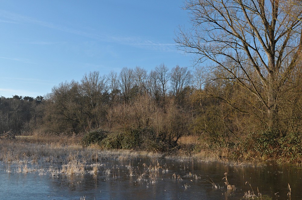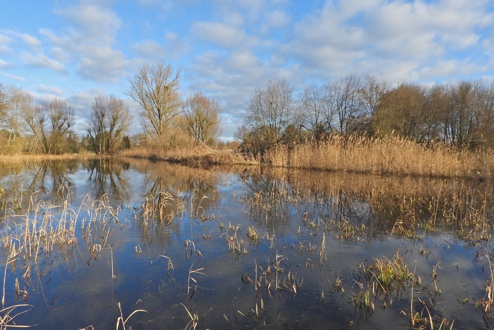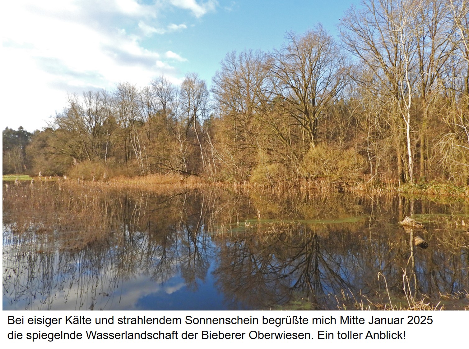 Bei eisiger Kälte und strahlendem Sonnenschein begrüßte mich Mitte Januar 2025 die spiegelnde Wasserlandschaft der Bieberer Oberwiesen.
