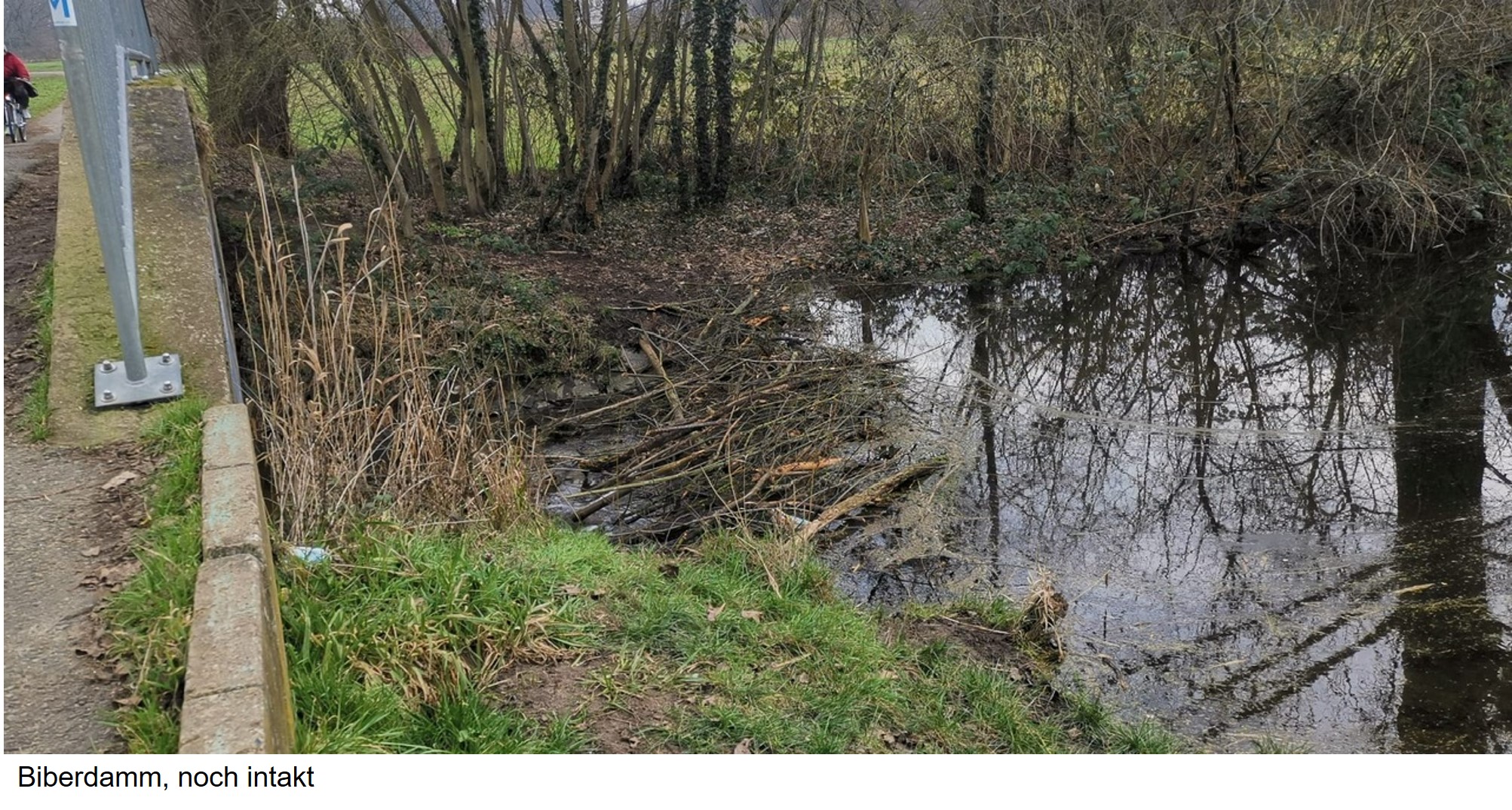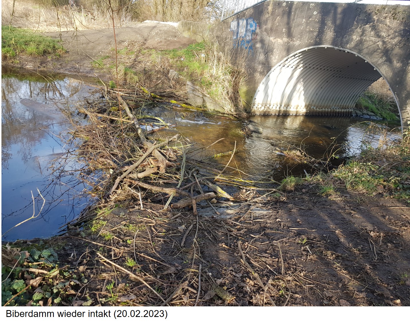 Nachdem am 15.02.2023 der Damm zerstört war (Bilder 2 und 3, vermutlich bei kleineren Bauarbeiten am Rande der Brücke) ist dieser am 20.02. wieder repariert – der Biber lässt sich nicht so leicht