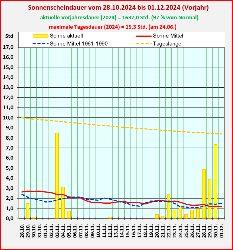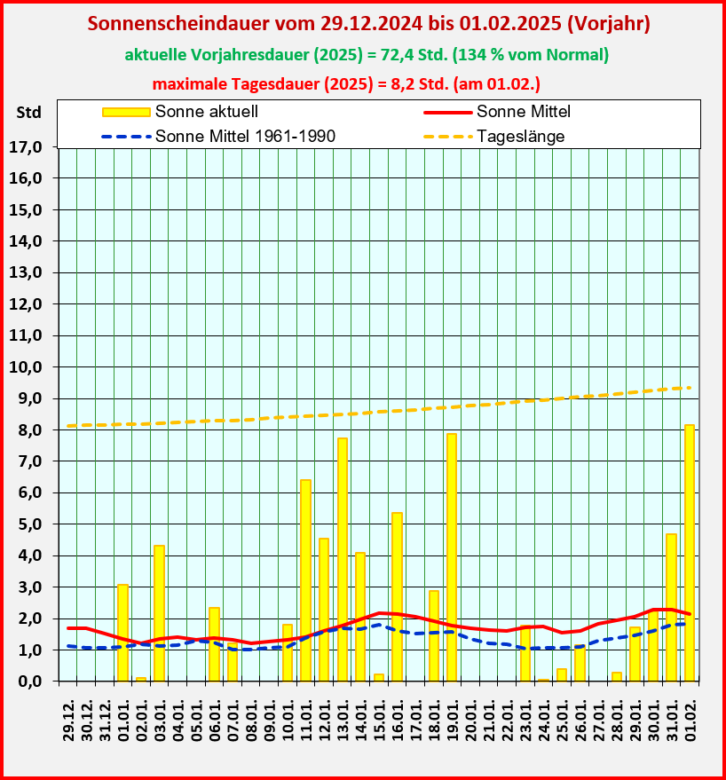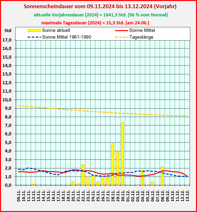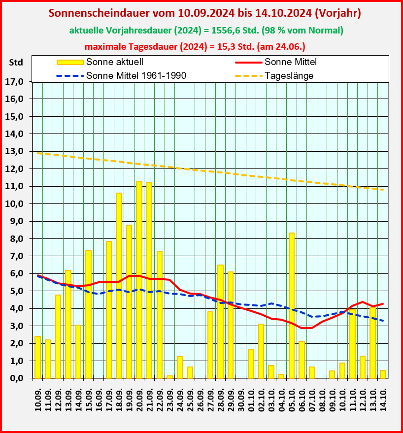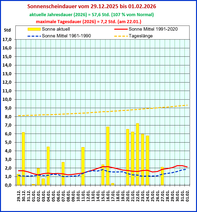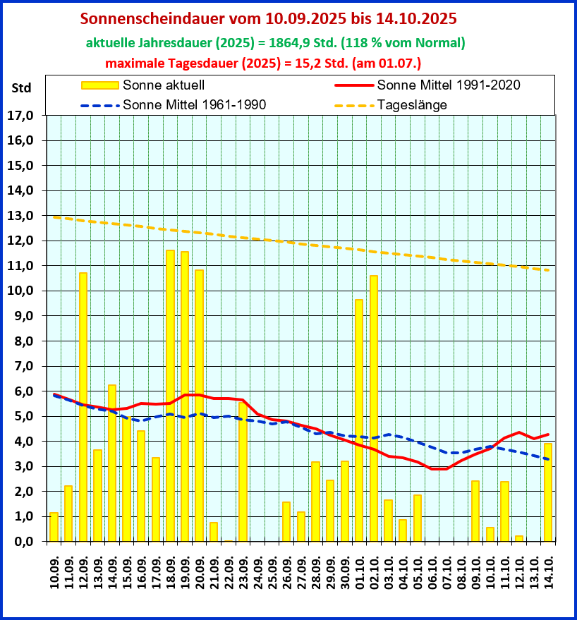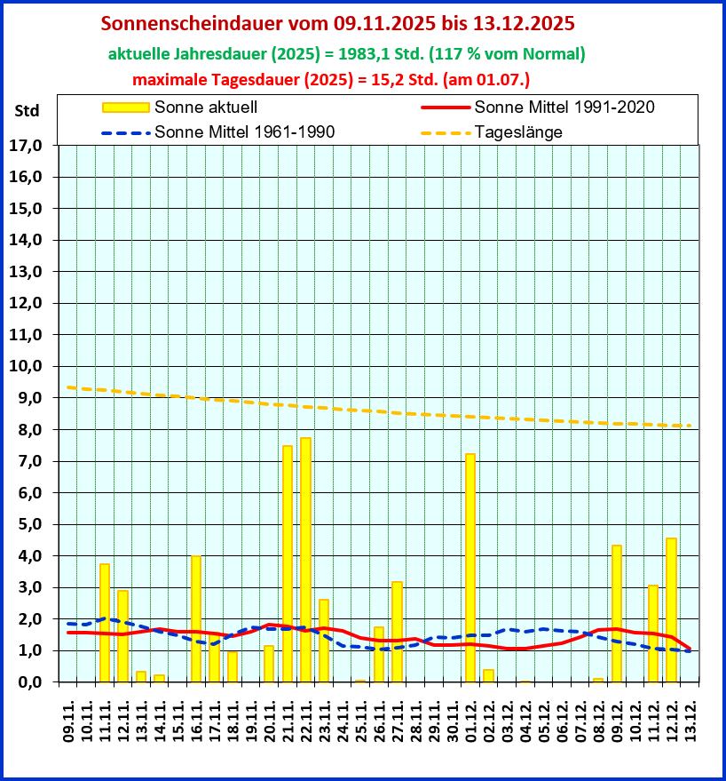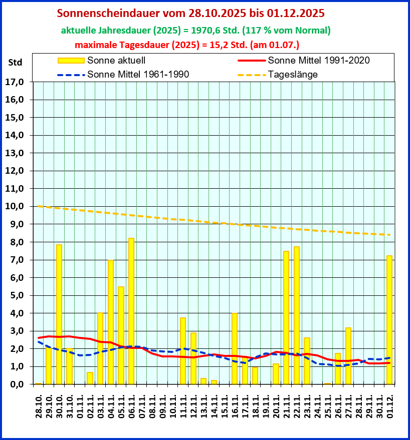 Bei der Sonnenscheindauer ist zusätzlich noch die Tageslänge hinzugefügt, die als Differenz von Sonnenauf- und Sonnenuntergang für Frankfurt ermittelt wird.