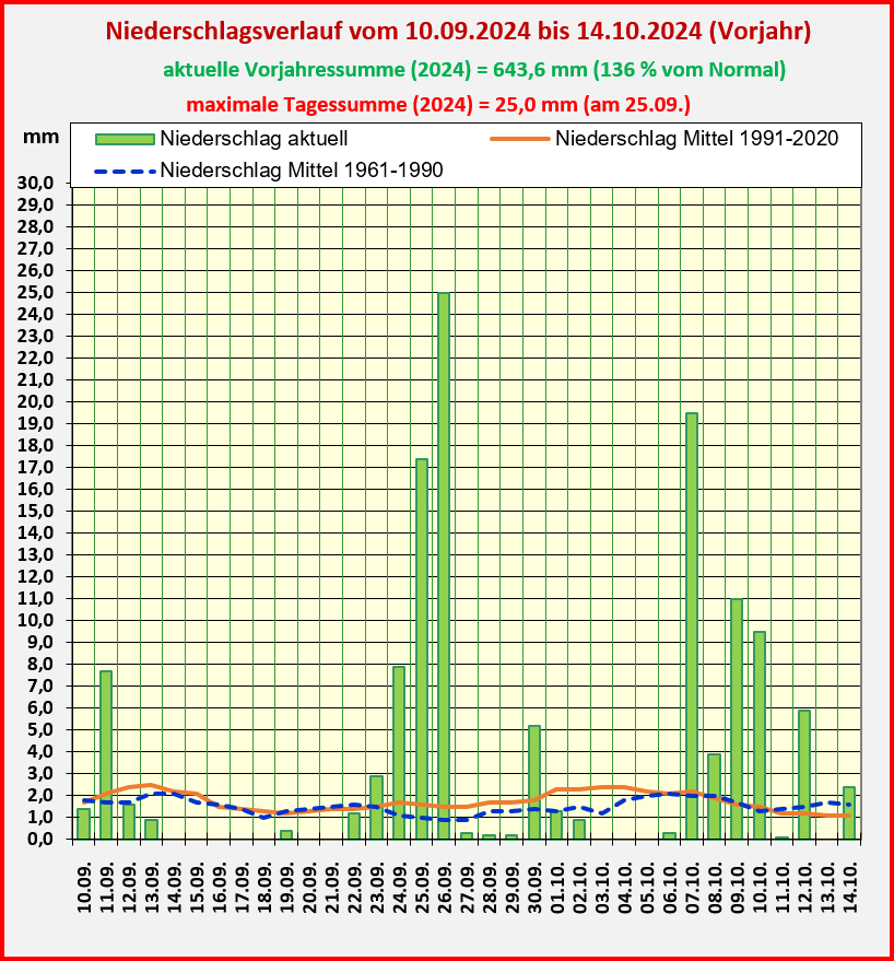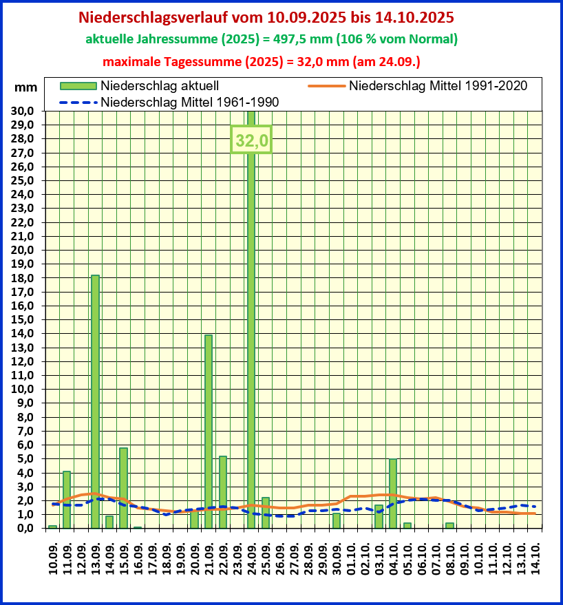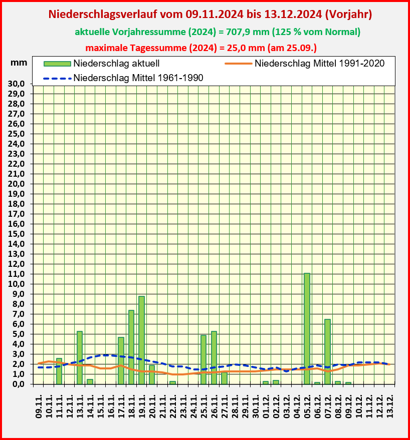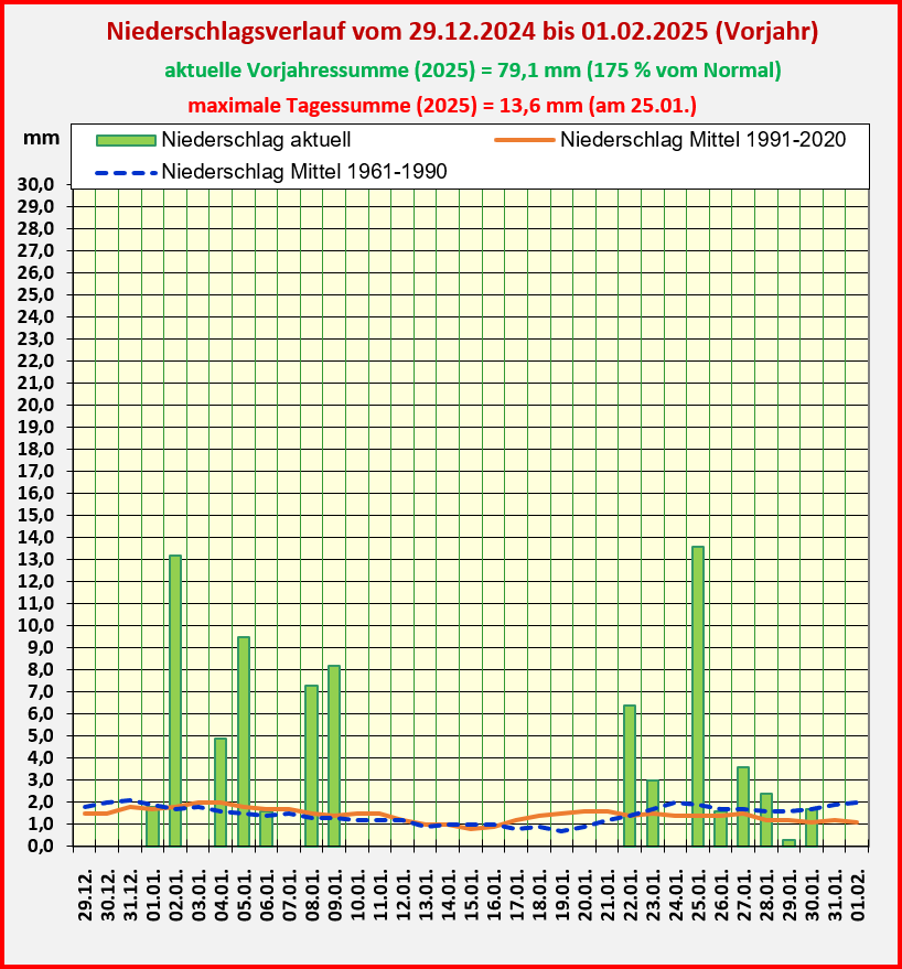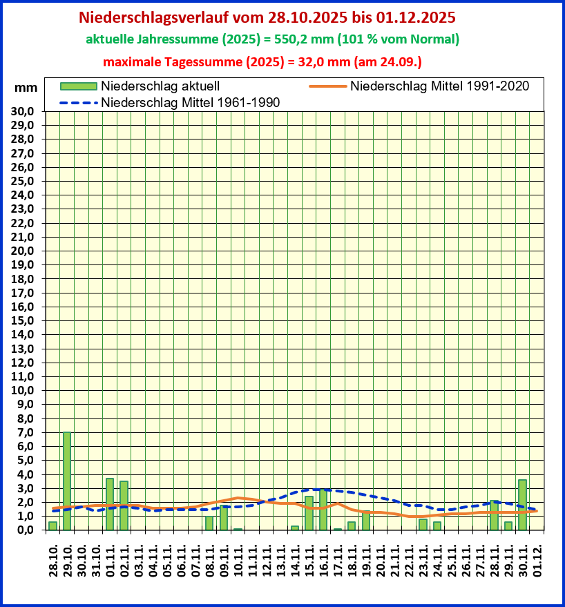 In den nachfolgenden Diagrammen werden die aktuellsten Daten (zurückliegende 35 Tage) der Temperatur, des Niederschlags und der