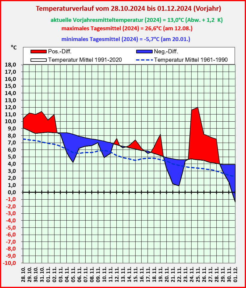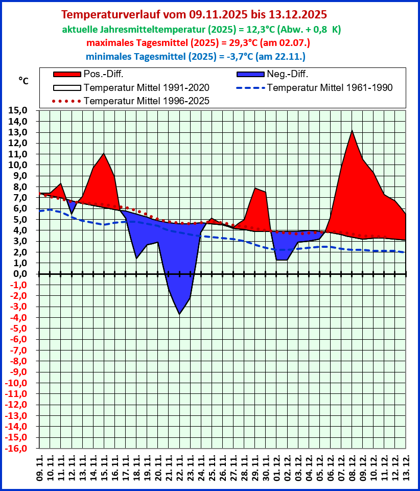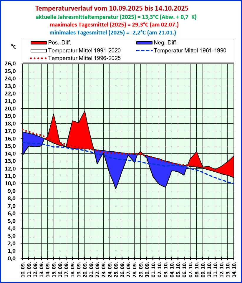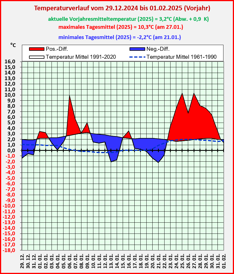 der vorangegangenen WMO-Referenzperiode 1961 bis 1990 dargestellt und im Temperaturdiagramm des aktuellen Jahres auch die Mittelwerte der zurückliegenden 30 Jahre, derzeit von 1996 bis