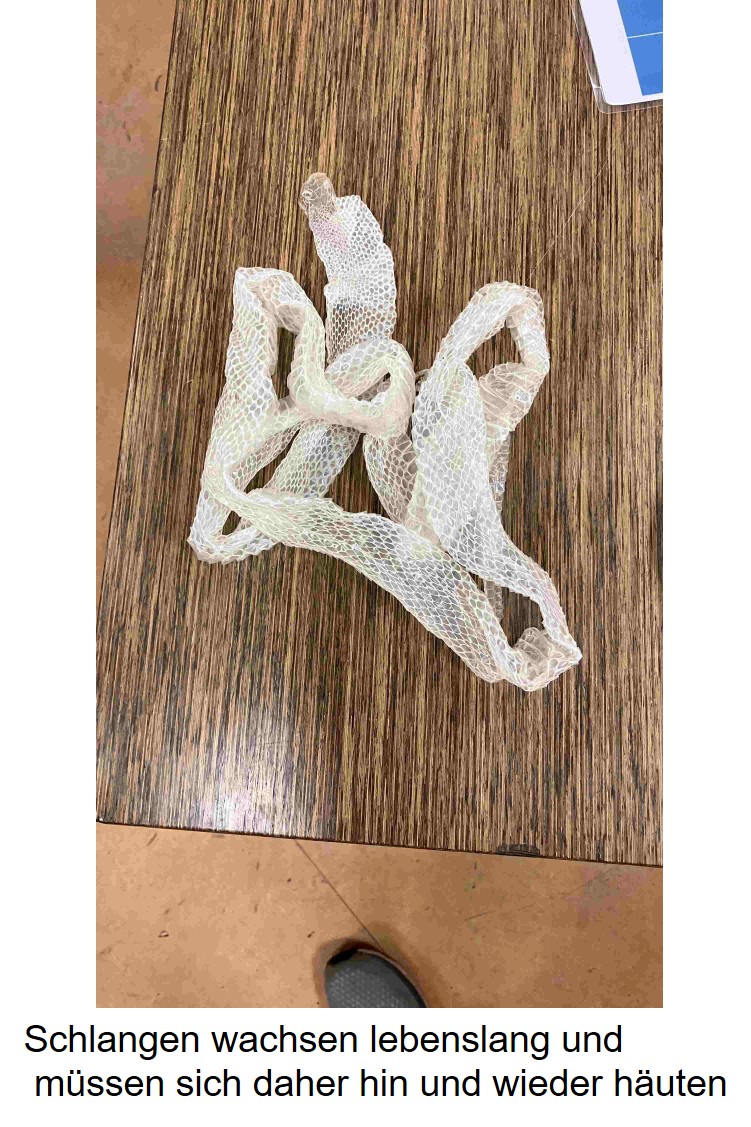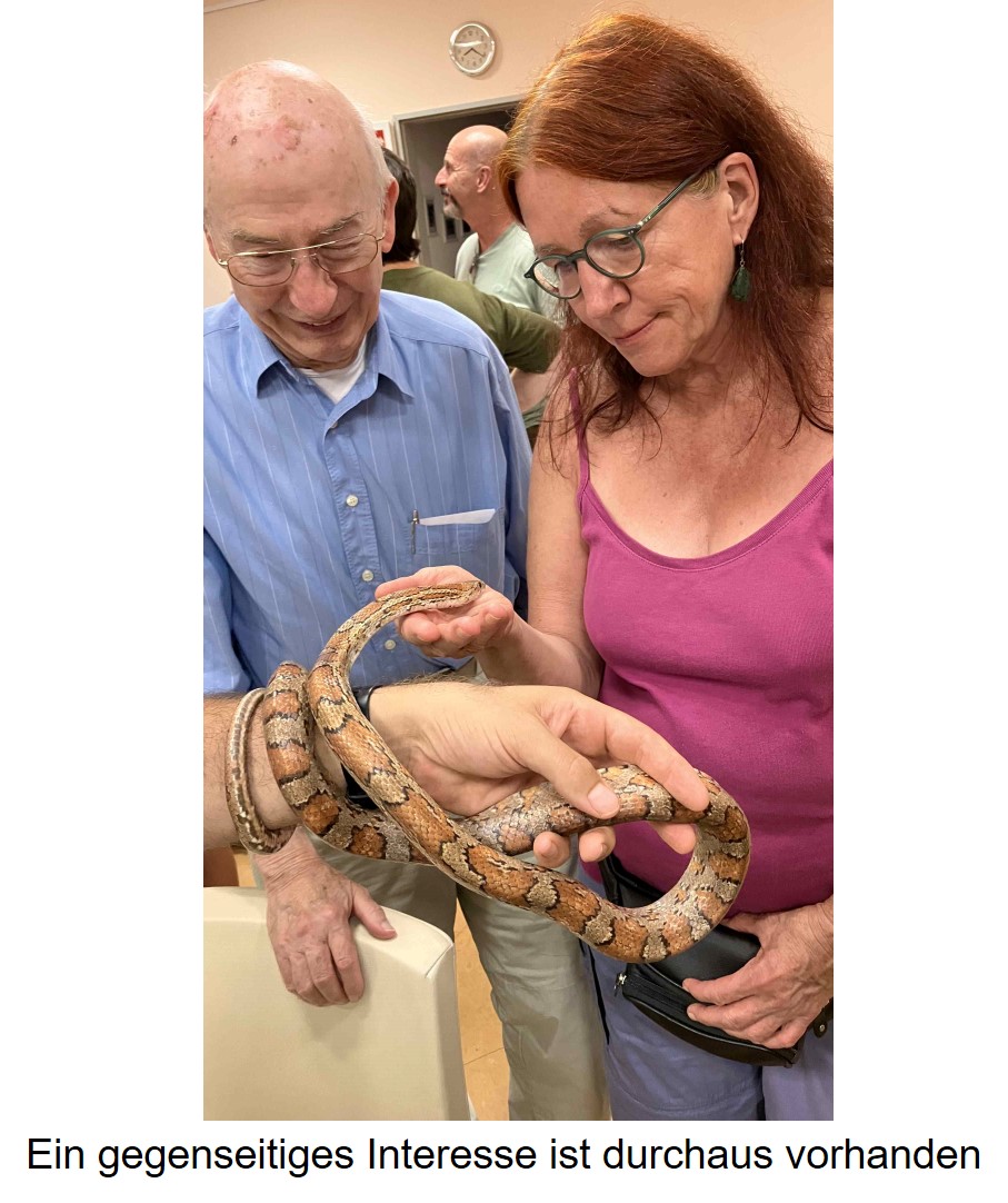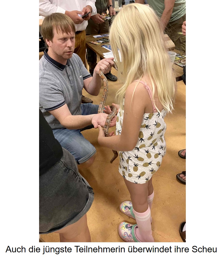 Zum Schluss packt Dr. Berg sein Haustier aus - eine lebendige Kornnatter. Diese gleitet unbedarft von Hand zu Hand und nach einer gewissen Scheu trauen sich immer mehr der Anwesenden, dieses Tier anzufassen. Es fühlt sich trocken, glatt und etwas kühl an. Für die meisten der Anwesenden war dies die erste Berührung einer lebendigen Schlange.